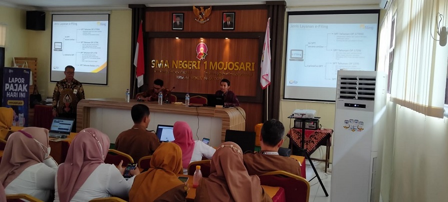 Kantor Pajak Mojosari menyelenggarakan sosialisasi tata cara pemadanan Nomor Induk Kependudukan (NIK) sebagai Nomor Pokok Wajib Pajak (NPWP) dan Pelaporan Surat Pemberitahuan (SPT) Tahunan secara online yang diadakan di ruang pertemuan SMA Negeri I Mojosari (Selasa, 24/1). Kegiatan dibuka dengan sambutan oleh Kepala KP2KP Mojosari Rahmat Basuki dengan memberikan pengantar singkat mengapa program ini perlu untuk dilakukan menuju Single Identity Number (SIN) dan kepatuhan dalam pelaporan SPT Tahunan. Rahmat mengungkapkan sangat senang karena pegawai yang ada SMA Negeri 1 Mojosari, baik PNS maupun PPPK, mau bekerja sama membantu kelancaran dalam pelaporan SPT Tahunan 2022. Beliau juga berharap kelak hubungan sinergi ini terus berjalan baik untuk optimalisasi penerimaan pajak pusat dan daerah.