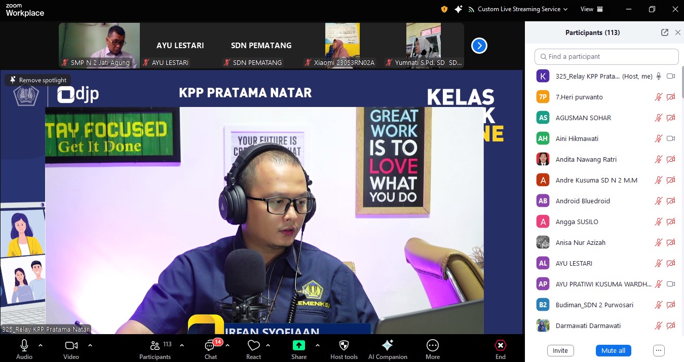 Kantor Pelayanan Pajak (KPP) Pratama Natar menyelenggarakan Kelas Pajak Coretax DJP bagi Dinas Pendidikan Kabupaten Lampung Selatan melalui media Zoom Meeting di KPP Pratama Natar, Kabupaten Lampung Selatan (Rabu, 26/2).