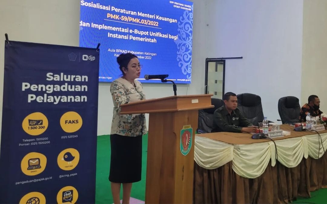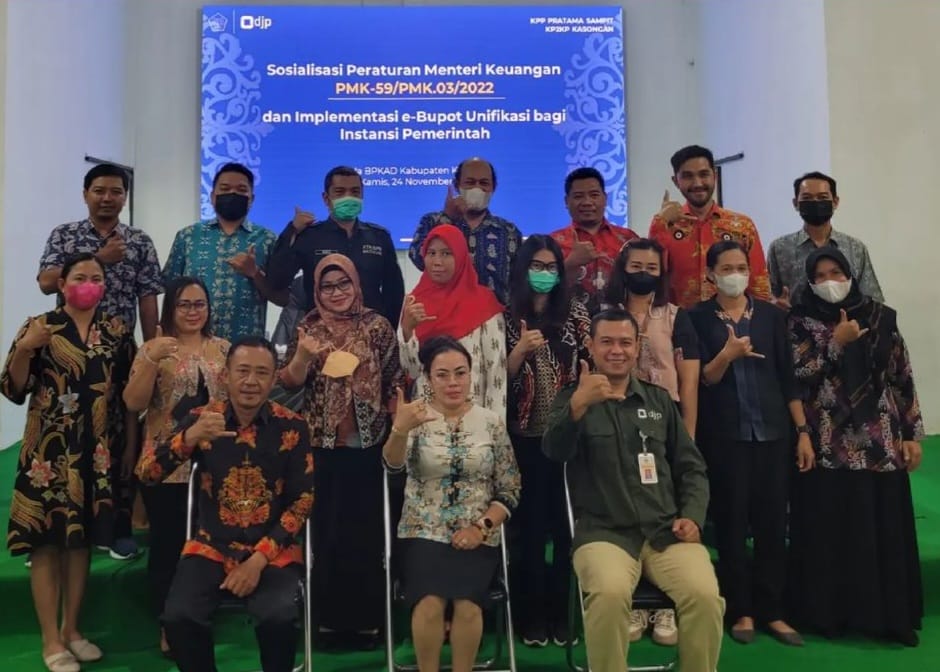 KPP Pratama Sampit dan KP2KP Kasongan, dengan dukungan penuh dari Sekretariat Daerah dan Badan Pengelola Keuangan dan Aset Daerah (BPKAD) Kabupaten Katingan, melaksanakan Sosialisasi Peraturan Menteri Keuangan Nomor 59/PMK.03/2022 dan Implementasi e-Bupot Unifikasi bagi Instansi Pemerintah di Aula BPKAD Kabupaten Katingan (Kamis, 24/11).