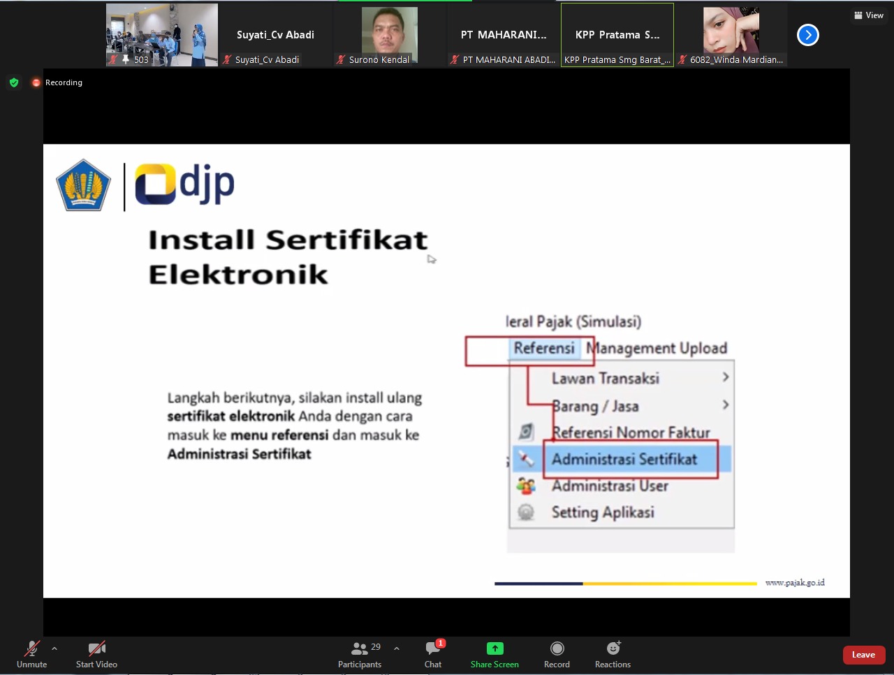 Kantor Pelayanan Pajak (KPP) Pratama Semarang Barat mengadakan kelas pajak terkait update aplikasi e-Faktur 3.2 dengan mengundang 25 Pengusaha Kena Pajak yang terdaftar di wilayah kerja Semarang Barat. Acara kelas pajak diadakan secara tatap muka dan bagi yang berhalangan hadir dapat mengikuti secara daring melalui zoom di Semarang (Rabu, 6/4).