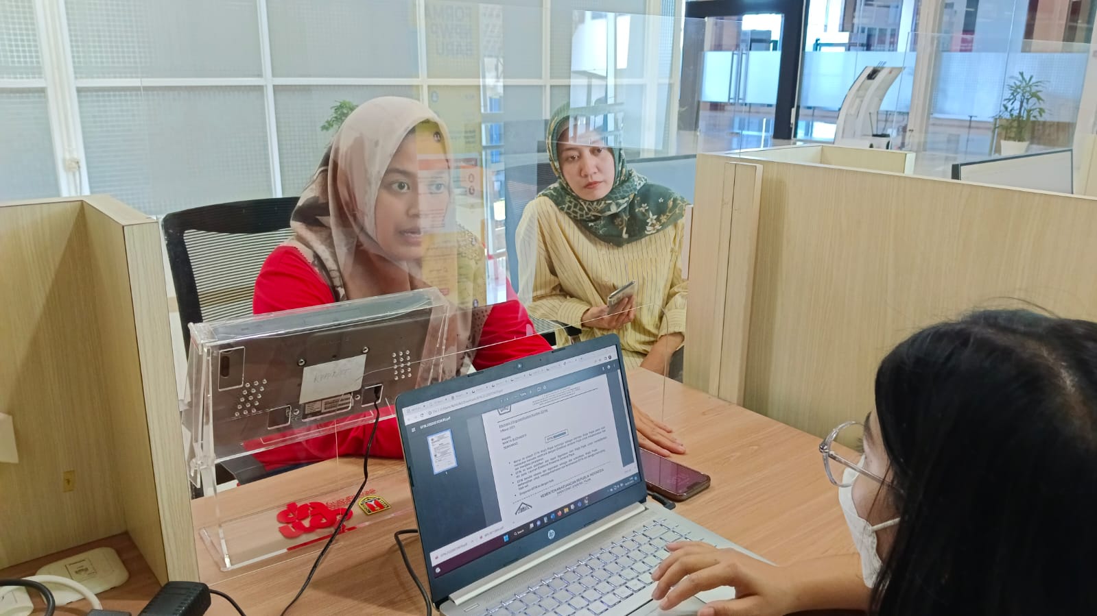 Asisten Penyuluh Pajak Terampil Nunung Fitrianingsih dan pelaksana Kantor Pelayanan Pajak (KPP) Pratama Semarang Timur Mutiara Karunia Priska memberikan pelayanan perpajakan kepada wajib pajak di Mal Pelayanan Publik (MPP) Kota Semarang, Mangkang Kulon, Kecamatan Tugu, Kota Semarang (Jumat, 3/3).