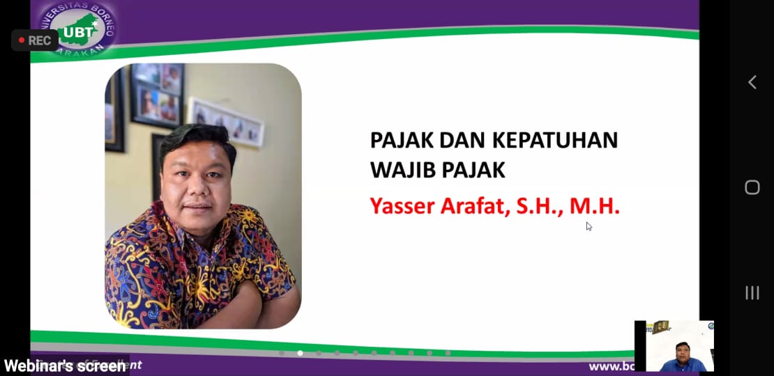 Yasser Arafat Dosen Fakultas Hukum UBT bersama Hilma Fandarin Agustin Account Representative KPP Pratama Tarakan memaparkan materi dasar perpajakan kepada para peserta yang terdiri dari anggota maupun bagian dari keluarga besar UBT. Hilma berkesempatan untuk memberika edukasi tentang pelaporan Surat Pemberitahuan (SPT) Tahunan melalui e-Filing.