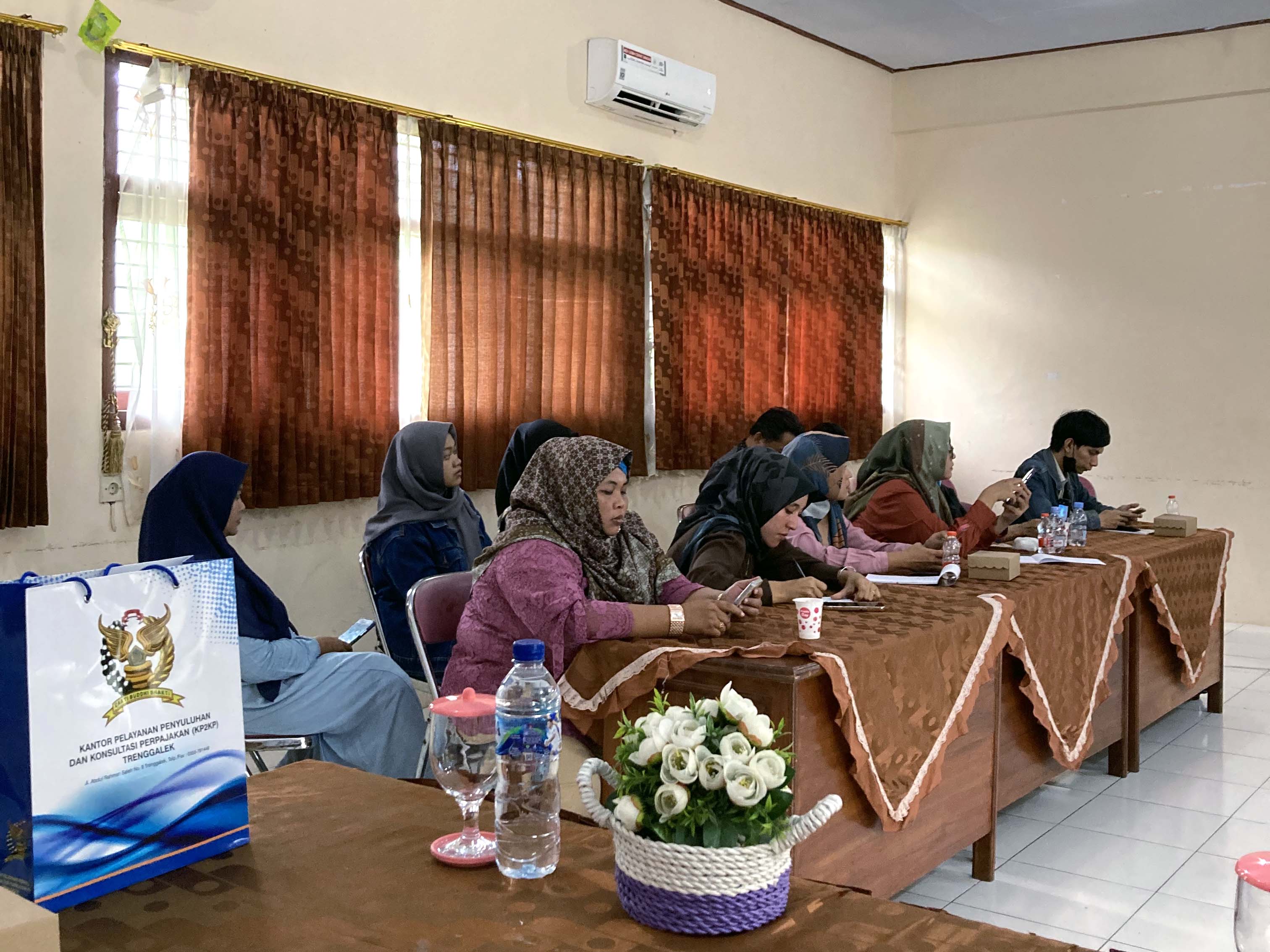 Penyuluh Pajak Kantor Pelayanan Pajak (KPP) Pratama Tulungagung dan Kantor Pelayanan, Penyuluhan, dan Konsultasi Perpajakan (KP2KP) Trenggalek menjelaskan tentang kewajiban perpajakan Wajib Pajak Usaha Mikro, Kecil, dan Menengah (UMKM) di hadapan 20 pelaku UMKM. Acara ini berlangsung di Aula Dinas Perindustrian dan Tenaga Kerja Kabupaten Trenggalek, Jawa Timur (Rabu, 30/10).
