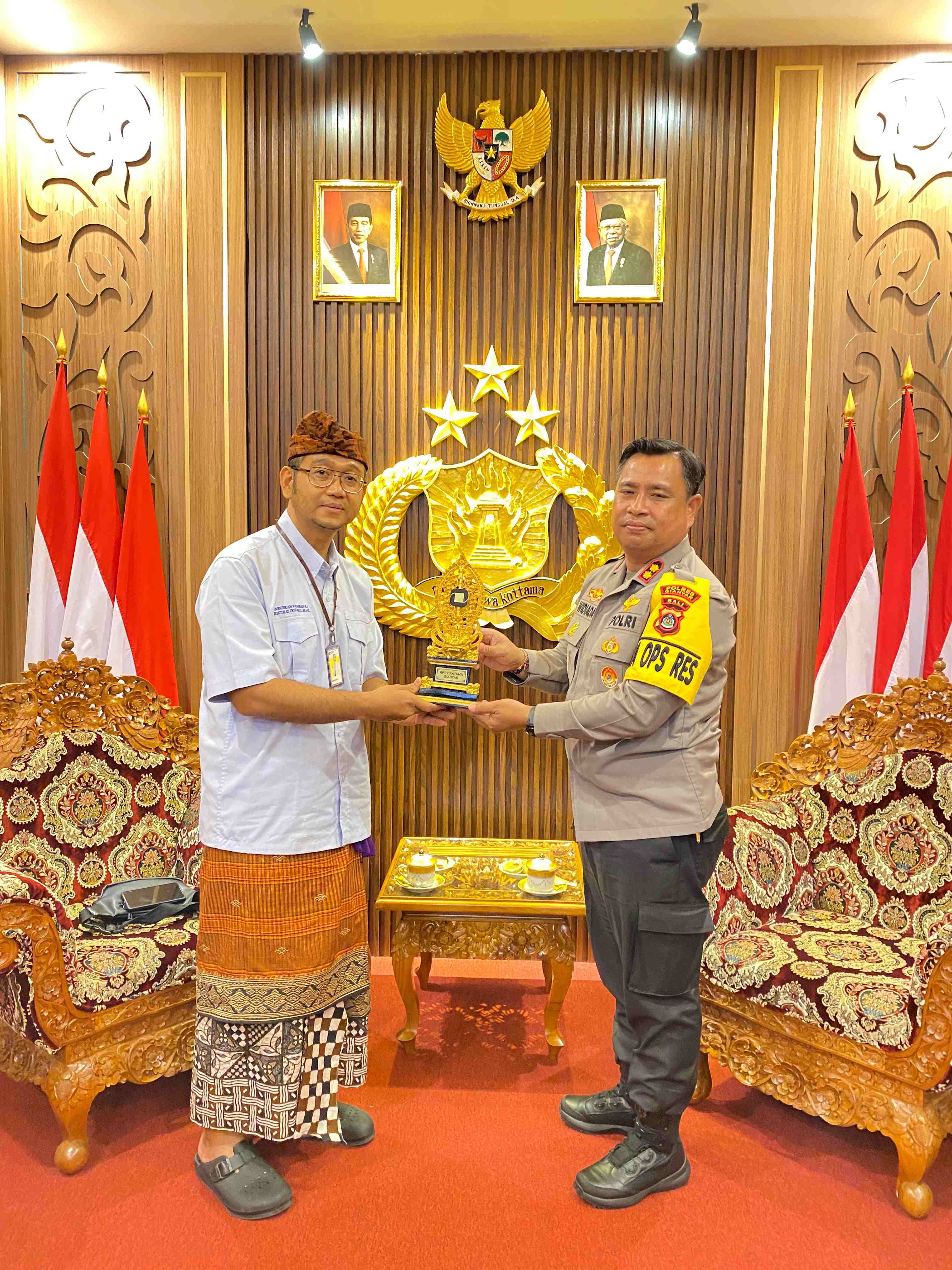 Kantor Pelayanan Pajak (KPP) Pratama Gianyar menyerahkan piagam penghargaan kepada Kepala Kepolisian Resor (Polres) Gianyar di Polres Gianyar, Kabupaten Gianyar, Bali (Kamis, 14/3). Penyerahan piagam penghargaan tersebut dalam rangka penyelenggaraan Pekan Panutan atas penyampaian Surat Pemberitahuan (SPT) Tahunan 2023. "Kami KPP Pratama Gianyar secara khusus memberikan apresiasi kepada para pejabat di wilayah kerja kami atas penyampaian SPT Tahunan secara tepat waktu," ungkap Abdul Gafur selaku Kepala KPP Pratama Gianyar.