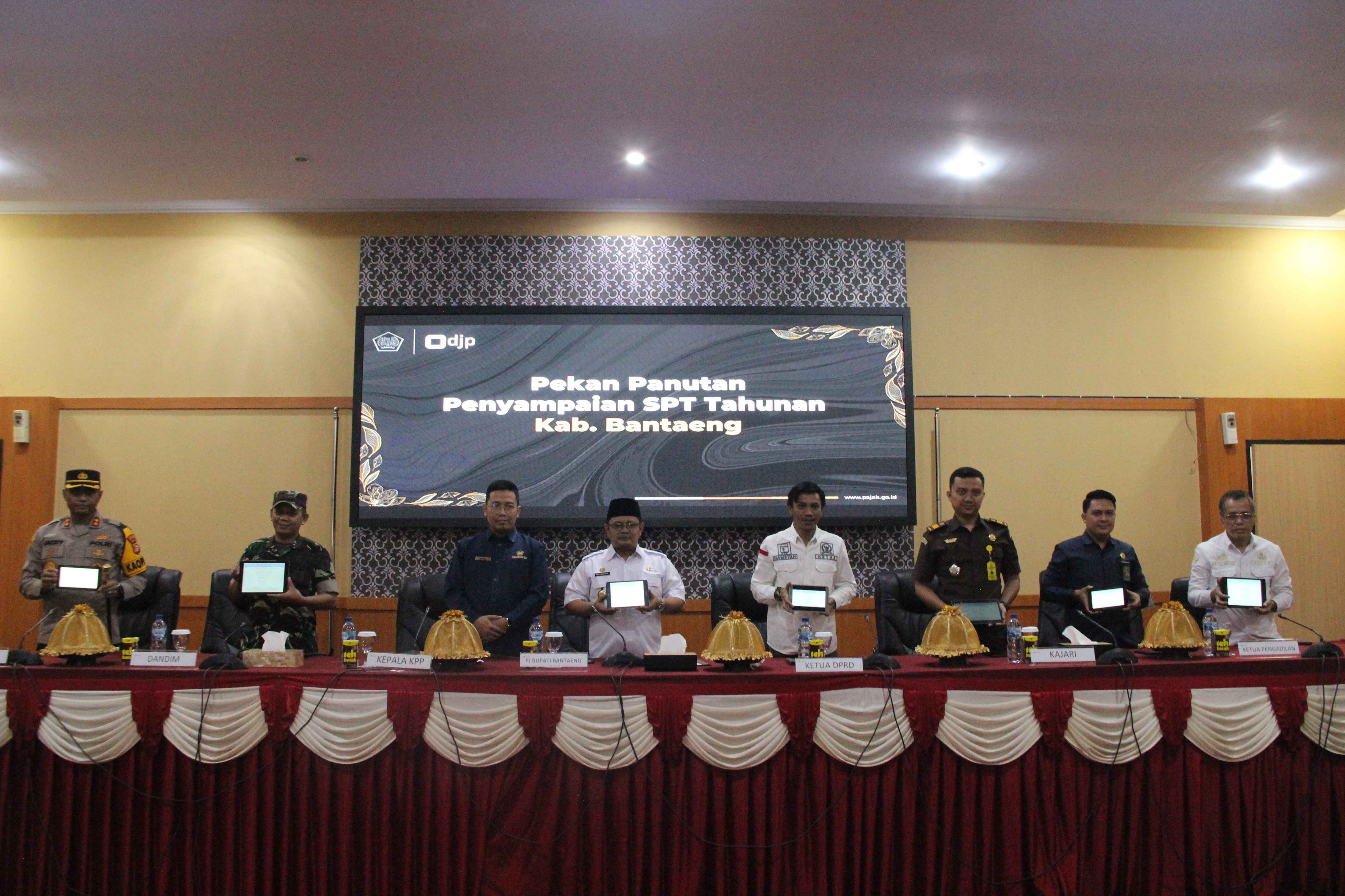 Kantor Pelayanan Pajak (KPP) Pratama Bantaeng bersama Penjabat (Pj.) Bupati Bantaeng dan seluruh jajaran Pemda menyelenggarakan kegiatan Pekan Panutan Penyampaian SPT Tahunan di Ruang Pola Kantor Bupati Bantaeng (Rabu, 21/2).
