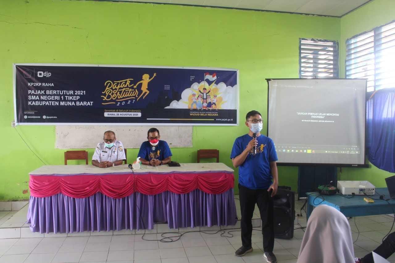 Kantor Pelayanan, Penyuluhan, dan Konsultasi Perpajakan (KP2KP) Raha menyelenggarakan kegiatan Pajak Bertutur secara luring di SMA Negeri 1 Tiworo Kepulauan, Kabupaten Muna Barat (Rabu, 25/8). Kegiatan ini dihadiri oleh 30 orang murid SMA Negeri 1 Tiworo Kepulauan dan dilaksanakan sesuai protokol kesehatan Covid-19.