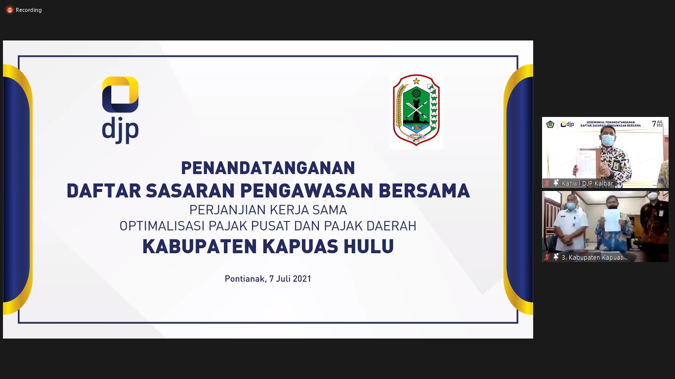 Pemerintah Kabupaten (Pemkab) Kapuas Hulu dan Direktorat Jenderal Pajak (DJP) menandatangani Daftar Sasaran Pengawasan Bersama (DSPB) periode tahun 2021 di lokasi masing-masing dengan terhubung secara daring di Kapuas Hulu dan Pontianak (Rabu, 7/7).