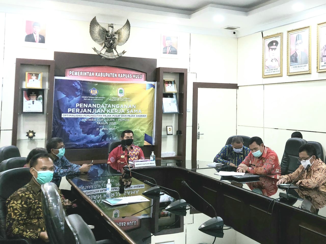 Pemerintah Daerah Kabupaten Kapuas Hulu turut menandatangani Perjanjian Kerja Sama (PKS) Optimalisasi Pemungutan Pajak Pusat dan Pajak Daerah tahun 2021 bersama Direktorat Jenderal Pajak (DJP) dan Direktorat Jenderal Perimbangan Keuangan (DJPK), di kantor Bupati Kapuas Hulu, Kabupaten Kapuas Hulu (Rabu, 21/4).