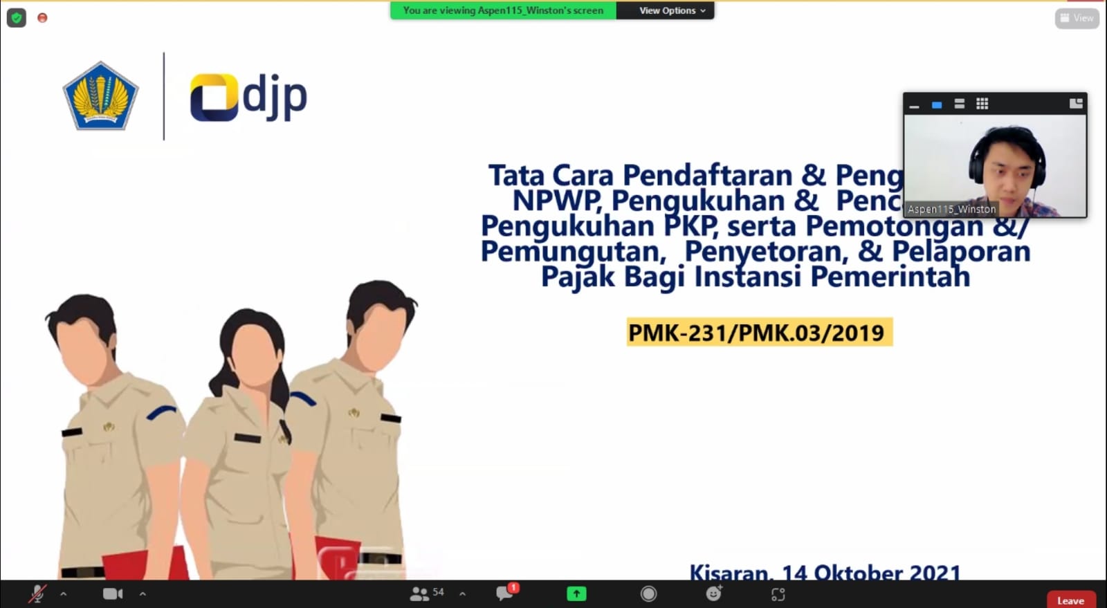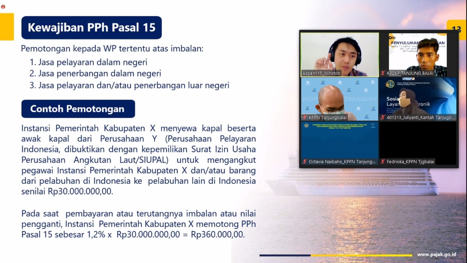 Kantor Pelayanan Pajak (KPP) Pratama Kisaran bekerja sama dengan Kantor Pelayanan Perbendaharaan Negara (KPPN) Tanjung Balai dan Kantor Pelayanan, Penyuluhan, dan Konsultasi Perpajakan (KP2KP) Tanjung Balai menyelenggarakan kegiatan edukasi perpajakan kepada unit-unit kerja mitra KPPN Tanjung Balai secara daring melalui aplikasi Zoom Meeting dari KPP Pratama Kisaran, Kabupaten Asahan, Sumatera Utara (Kamis, 14/10).