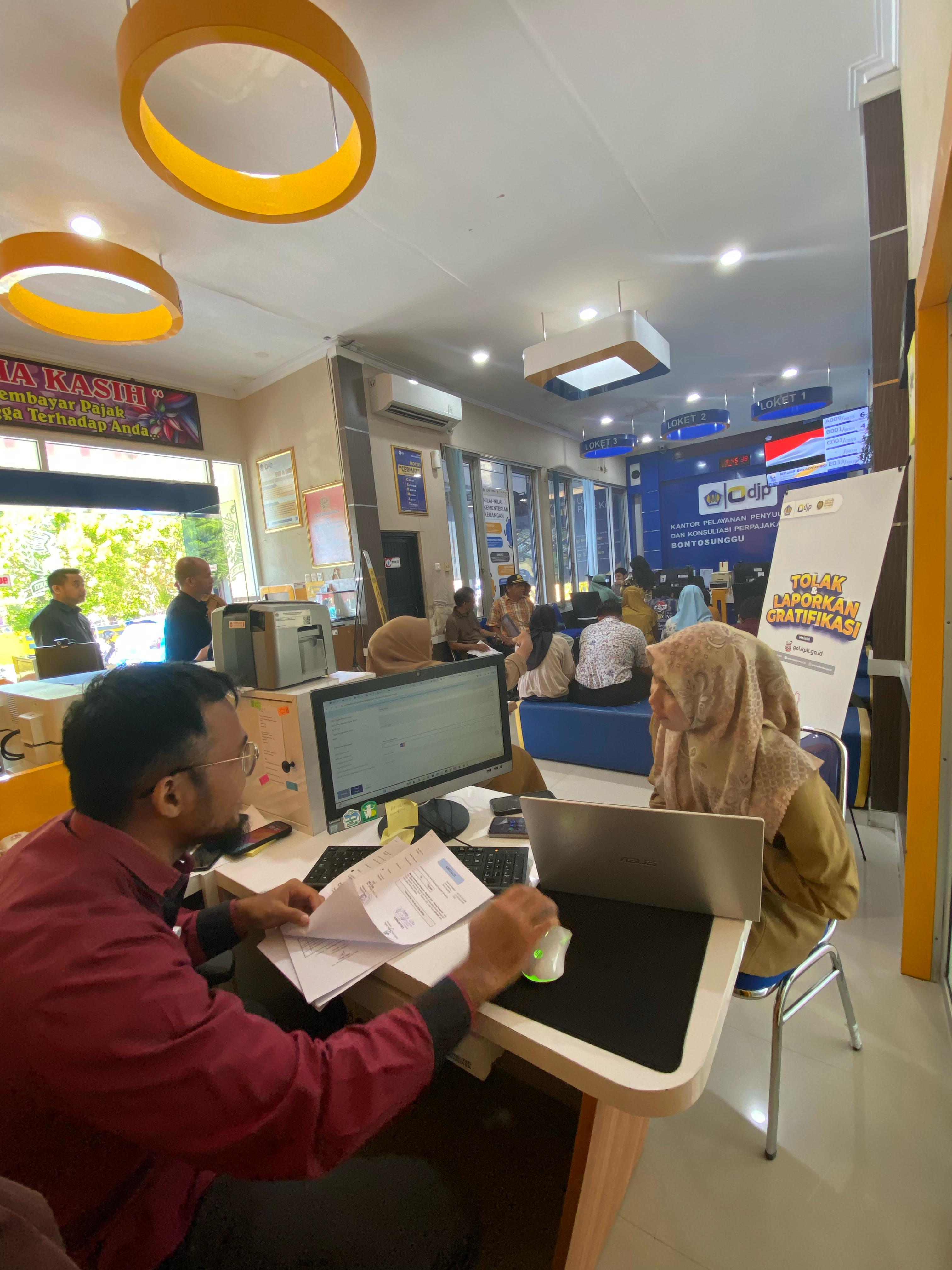 Penyuluh Pajak KPP Pratama Bantaeng, Dian Darmawan, memberikan penjelasan kepada Wajib Pajak Bendahara Instansi Pemerintah terkait penghapusan sanksi administrasi atas keterlambatan pembayaran dan/atau pelaporan pajak sehubungan dengan implementasi Coretax DJP (Selasa, 4/3).