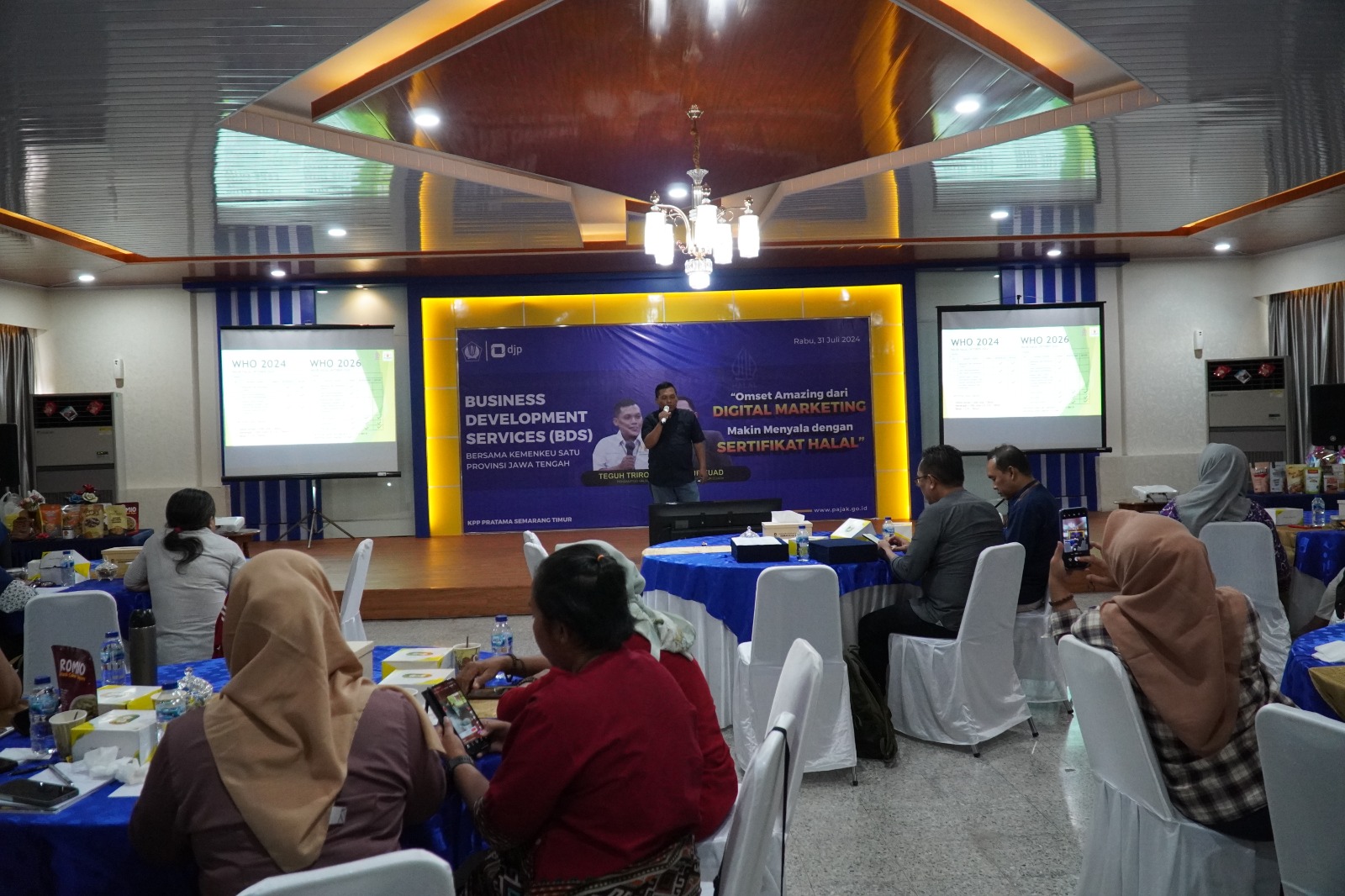 “Sekarang semua serba digital pakai tiktok segala macam, acara ini kita harapkan bisa meningkatkan kegiatan usaha” ungkap Pestamen Situmorang Kepala KPP Pratama Semarang Timur saat membuka kegiatan Business Development Services (BDS) dengan tema “Omset Amazing dari Digital Marketing, Makin Menyala dengan Sertifikat Halal” bertempat di aula lantai 4 KPP Pratama Semarang Timur, Semarang. (Rabu, 31/7).