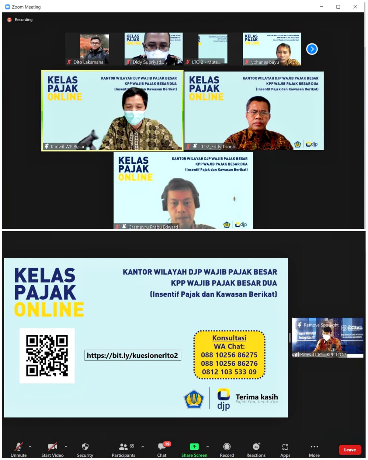 Kantor Wilayah Direktorat Jenderal Pajak (Kanwil DJP) Wajib Pajak Besar dan Kantor Pelayanan Pajak (KPP) Wajib Pajak Besar Dua kembali mengadakan kelas pajak secara daring melalui Zoom Meeting di Jakarta (Rabu, 4/8).