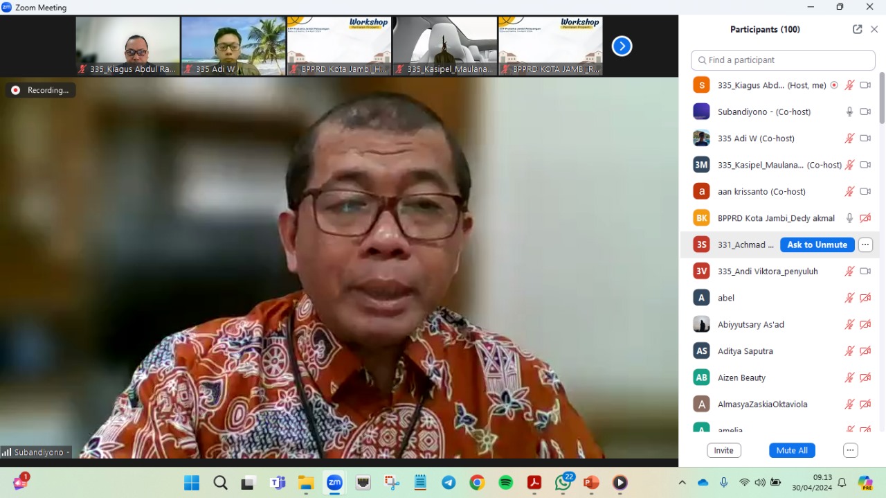 Kegiatan berlangsung dari Pukul 09.00 s.d 11.30 melalui zoom meeting dengan peserta yang terdiri dari perwakilan Wajib Pajak, perwakilan Ikatan Konsultan Pajak Indonesia (IKPI) Cabang Jambi dan pegawai Badan Pengelola Pajak dan Retribusi Daerah Kota Jambi. Kegiatan ini bertujuan untuk memberikan penjelasan aspek perpajakan terkait PPN KMS, PPh, PBB dan Penilaian.