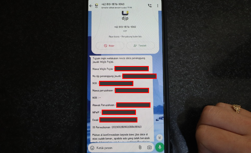 “Pada pukul 07.40 WITA, oknum tersebut menelepon suami saya untuk meminta verifikasi data perusahaan saya. Di telepon tersebut suami saya memberikan data email perusahaan. Setelah itu suami saya bilang akan datang ke kantor pajak saja, tapi pelaku bersikeras agar diselesaikan lewat telepon. Di sore harinya, oknum bernama Rian tersebut kembali menelepon dan kami abaikan. Akhirnya pagi hari ini dia mengirimkan pesan whatsapp lewat nomor 081318761040,” cerita AEN.