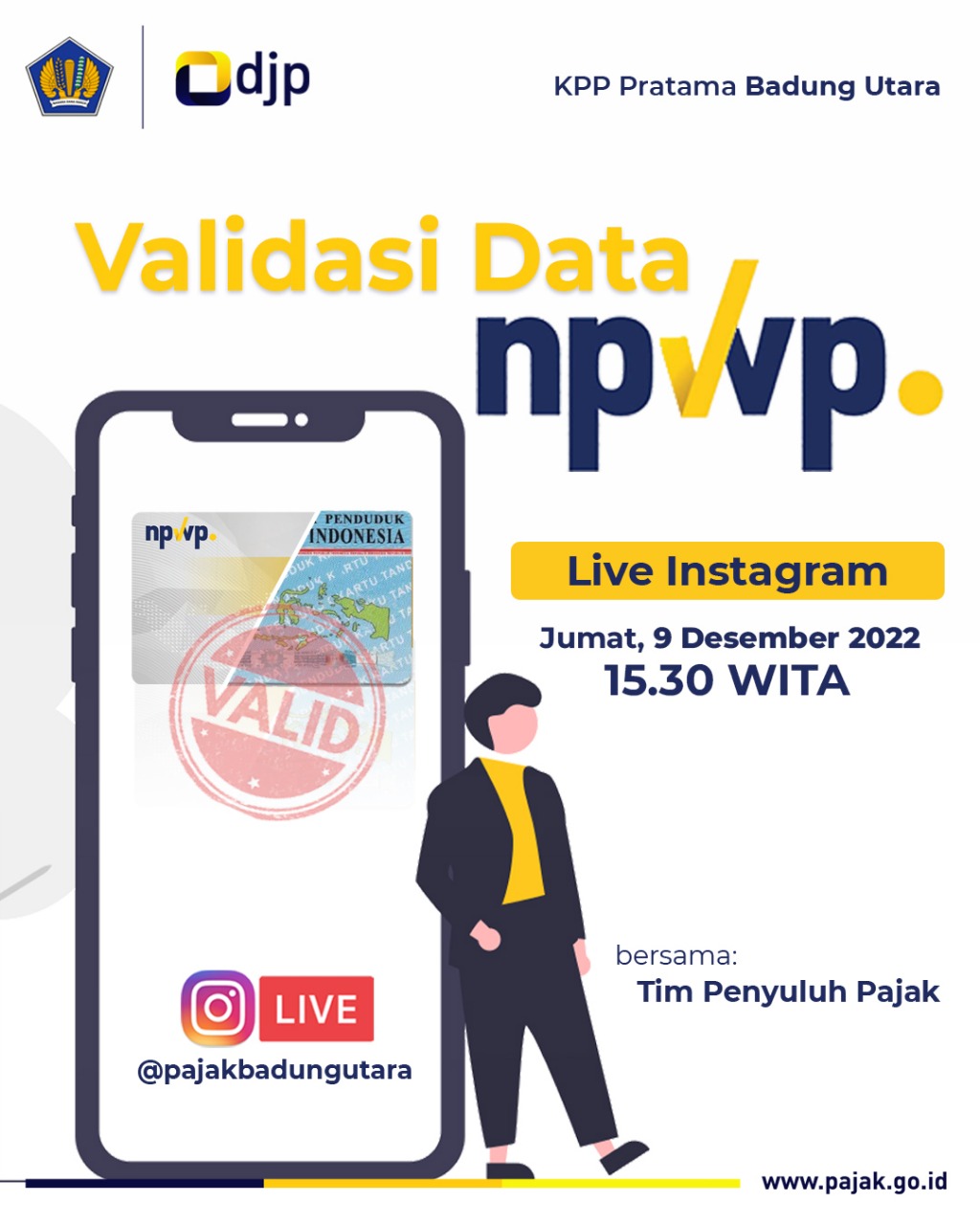 Penyuluh Pajak Kantor Pelayanan Pajak (KPP) Pratama Badung Utara sampaikan sosialisasi melalui live Instagram di Denpasar (Jumat, 9/12). Kegiatan ini dilaksanakan dalam rangka meningkatkan validasi Nomor Induk Kependudukan (NIK) dan Nomor Pokok Wajib Pajak (NPWP).