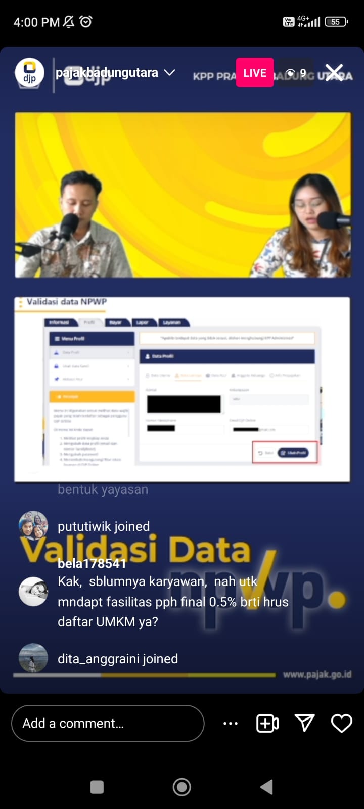 Siaran ini diikuti oleh pengikut Instagram KPP sejumlah 46 akun dengan durasi selama 48 menit. Interaksi berupa pertanyaan seputar validasi data identitas wajib pajak serta permasalahan NPWP ganda.