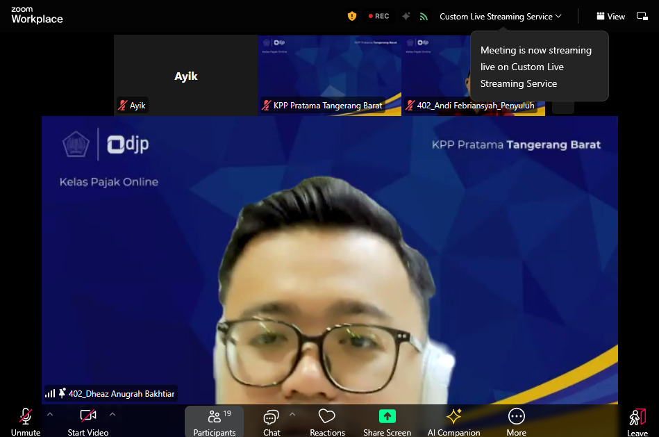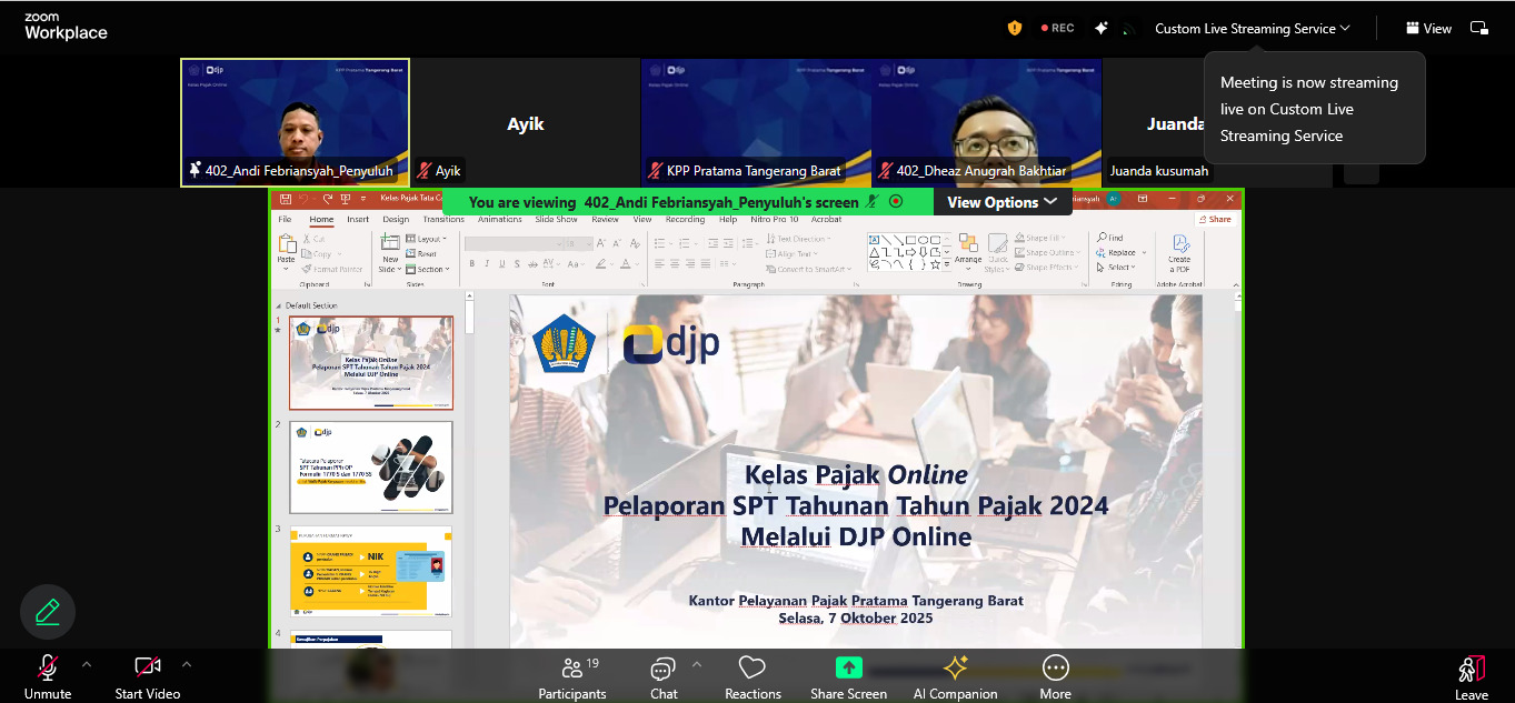 Kantor Pelayanan Pajak (KPP) Pratama Tangerang Barat kembali menggelar kegiatan kelas pajak secara daring melalui aplikasi Zoom Meetings bertempat di KPP Pratama Tangerang Barat, Jalan Imam Bonjol Nomor 47, RT 002 RW 004, Sukajadi, Karawaci, Kota Tangerang, Banten (Selasa, 7/10).