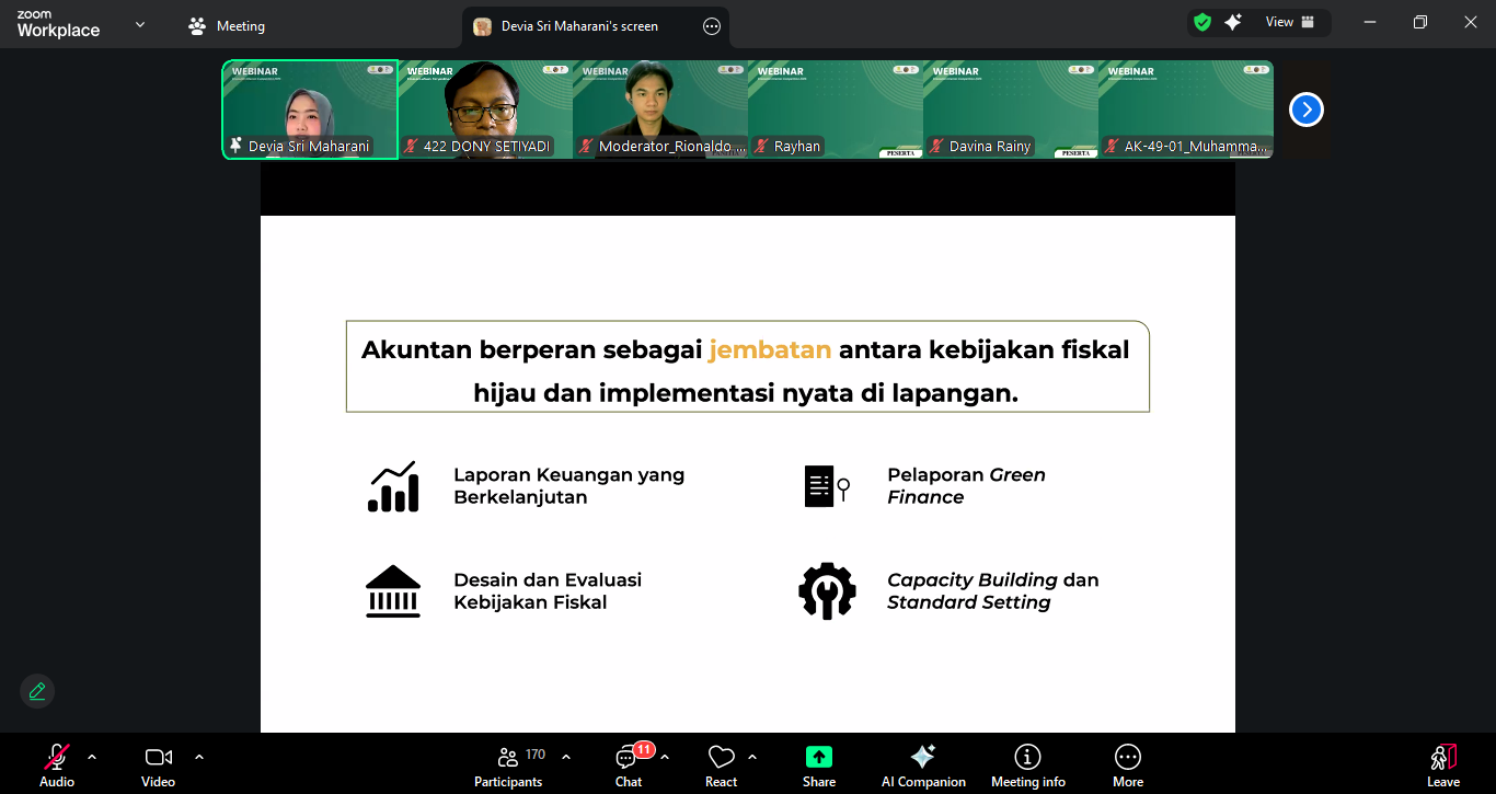 “Akuntan berperan sebagai jembatan atau penghubung antara kebijakan fiskal hijau dan implementasi nyata di lapangan melalui laporan keuangan yang berkelanjutan, desain dan evaluasi kebijakan fiskal, pelaporan green finance, serta capacity building dan standar setting,” ujarnya.