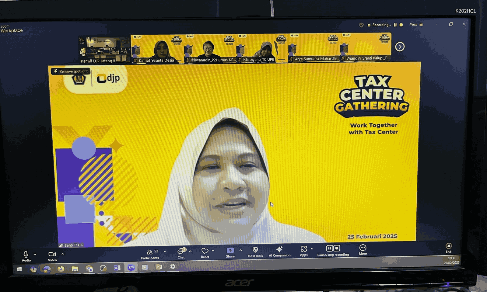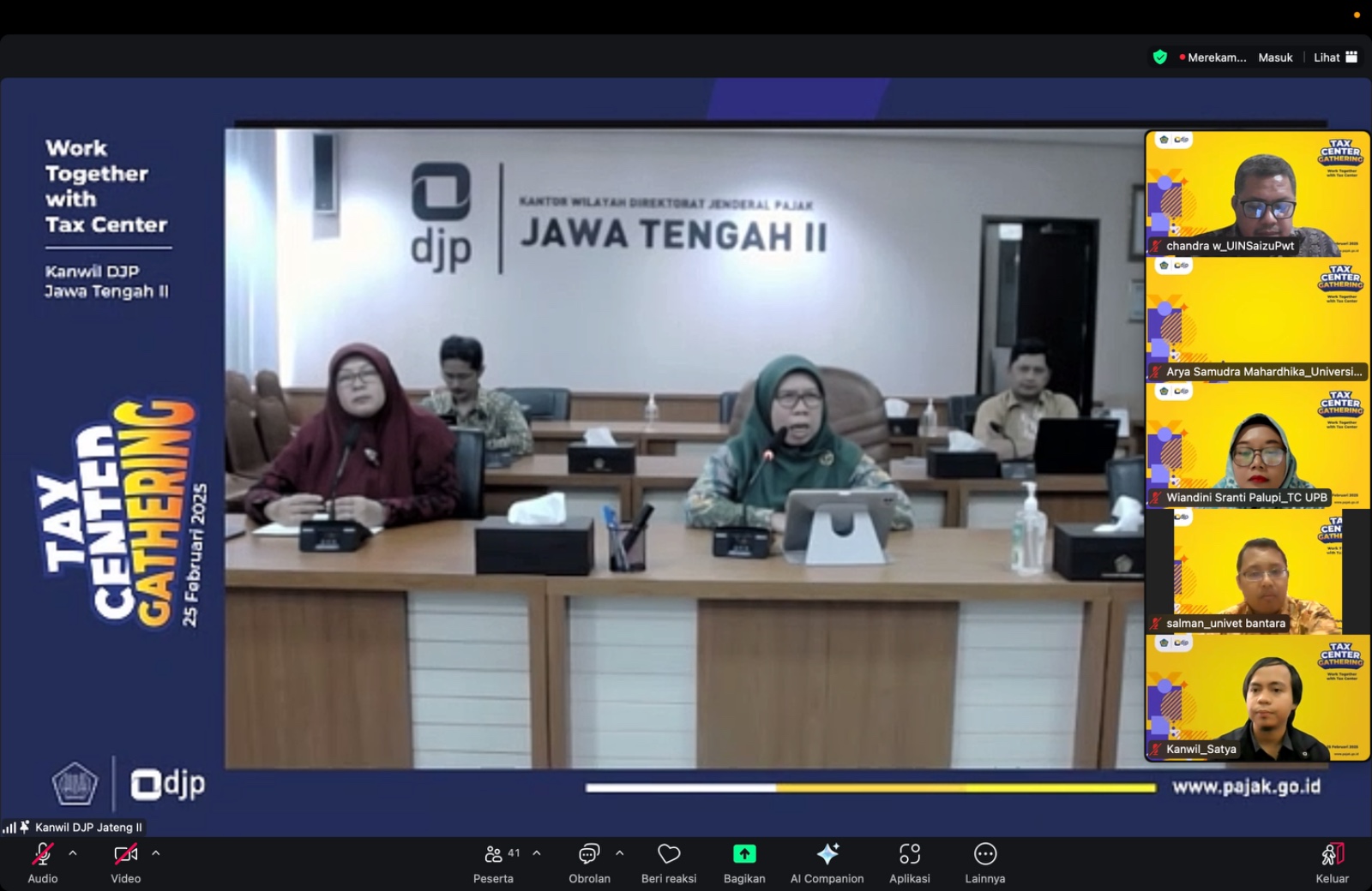 Sejumlah Tax Center dari berbagai perguruan tinggi di Jawa Tengah mengikuti kegiatan Tax Center Gathering 2025 yang diselenggarakan secara daring oleh Kantor Wilayah Direktorat Jenderal Pajak (Kanwil DJP) Jawa Tengah II (Selasa, 25/2). Kegiatan ini menjadi momen penting bagi akademisi untuk memperdalam pemahaman tentang peran strategis Tax Center dalam edukasi perpajakan.