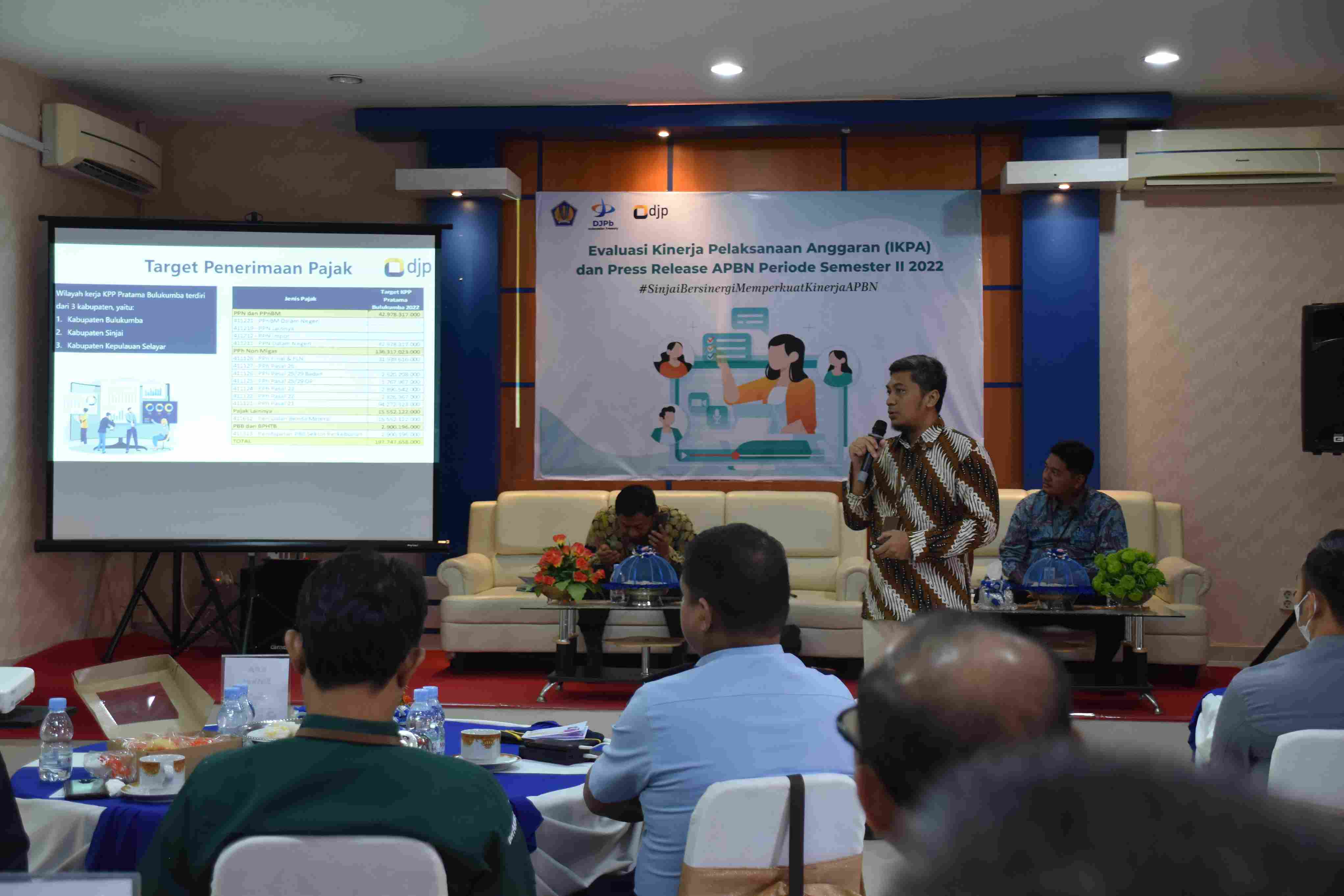 Kantor Pelayanan, Penyuluhan, dan Konsultasi Perpajakan (KP2KP) Sinjai, mewakili Kantor Pelayanan Pajak (KPP) Pratama Bulukumba, hadir dalam kegiatan evaluasi Kinerja Pelaksanaan Anggaran (IKPA) dan press release APBN periode semester II tahun 2022 (Selasa, 28/2). Kegiatan ini diselenggarakan oleh Kantor Pelayanan Perbendaharaan Negara (KPPN) Sinjai di Aula KPPN Sinjai.
