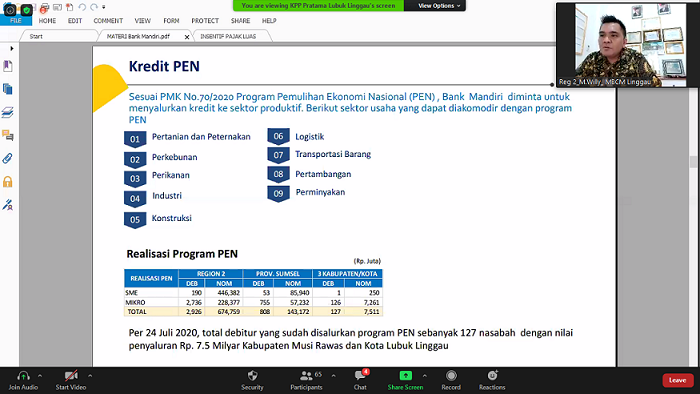 Dalam BDS kali ini, KPP Pratama Lubuklinggau juga menggandeng PKN STAN dan Bank Mandiri Kota Lubuklinggau. Pemberian materi disampaikan oleh tiga narasumber, yaitu: M. Willy Virdian, ST, MBAT (Bank Mandiri Kota Lubuk Linggau), Dian Fitriana, M.Si, M.AppEc (KPP Pratama Lubuklinggau), dan Khusnaini, S.ST, Ak, M.A.B (PKN STAN). Khusnaini adalah penulis buku "Cegah Bangkrut dengan Handphone (Aplikasi Akuntansi UKM)." Materi yang dibawakan dalam kegiatan ini adalah Subsidi Bunga untuk Pembiayaan UMKM dalam rangka Mendukung Pelaksanaan Program Pemulihan Ekonomi Nasional (PMK 65/2020), Insentif Pajak untuk UMKM Terdampak Pandemi Covid-19 (PMK 86/2020), dan yang terakhir Laporan Keuangan Sederhana untuk Pelaku UMKM.