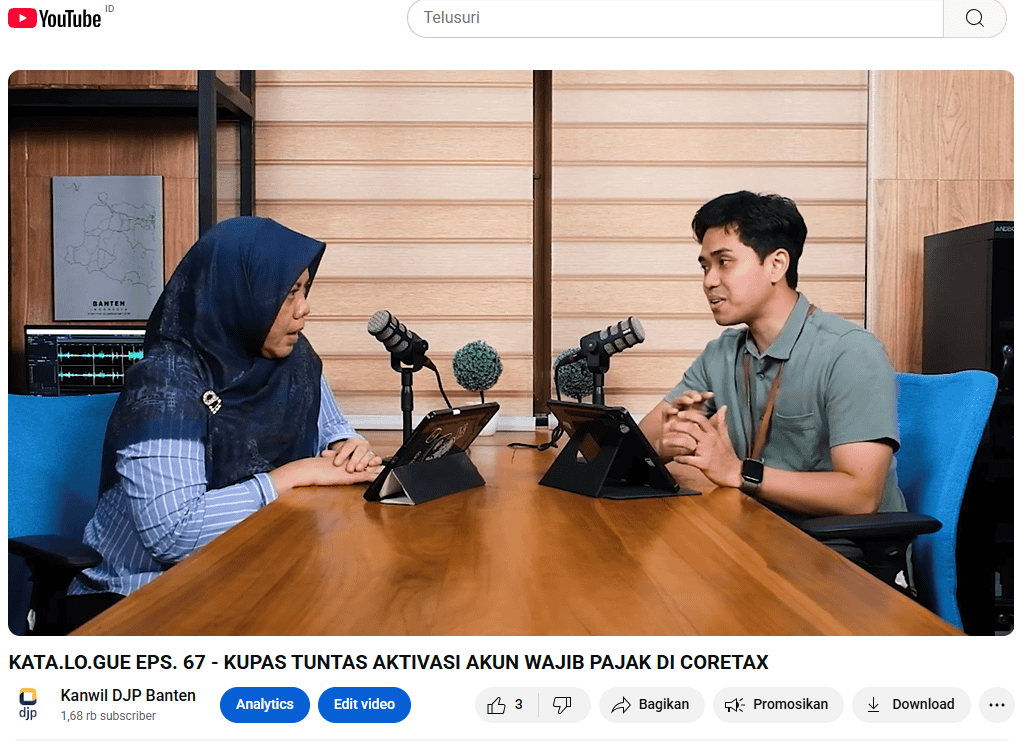 Untuk mengedukasi sekaligus mendukung kelancaran implementasi aplikasi Coretax DJP, Kantor Wilayah Direktorat Jenderal Pajak (Kanwil DJP) Banten menghadirkan episode terbaru siniar "Katalogue" dengan judul Kupas Tuntas Aktivasi Akun Wajib Pajak pada Coretax DJP (Rabu, 24/9). Episode ini adalah siniar ke-67 yang tayang di kanal resmi Youtube Kanwil DJP Banten.