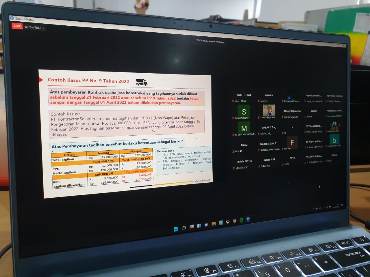 Kantor Pelayanan Pajak (KPP) Pratama Tarakan menyelenggarakan kegiatan Sosialisasi Perubahan Tarif Pajak Penghasilan (PPh) Usaha Jasa Kontruksi kepada Wajib Pajak Badan melalui Zoom Meeting di Kota Tarakan, Kalimantan Utara (Rabu, 13/04).