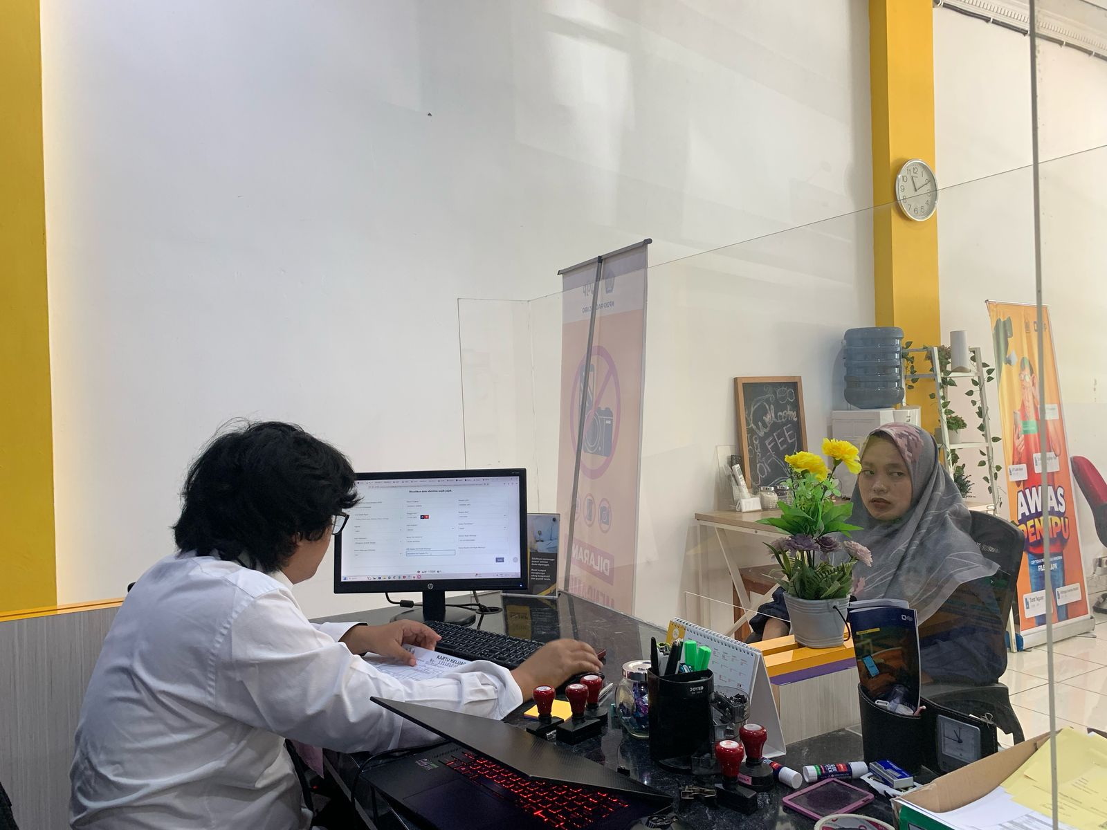 Pegawai Kantor Pelayanan, Penyuluhan, dan Konsultasi Perpajakan (KP2KP) Padang Aro memberikan penjelasan terkait peraturan pendaftaran Nomor Pokok Wajib Pajak (NPWP) pada seorang wajib pajak yang datang untuk memperoleh layanan pendaftaran di Kabupaten Solok Selatan (Senin, 28/4).