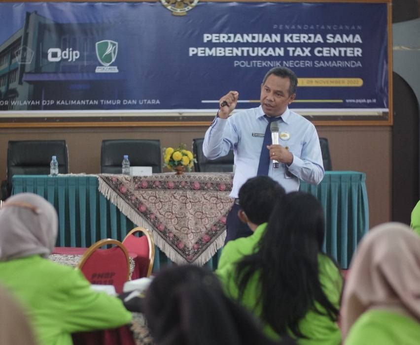 Kepala Kantor Wilayah DJP Kalimantan Timur dan Utara Max Darmawan secara langsung menandatangani Perjanjian Kerja Sama Pembentukan Tax Center bersama Direktur Politeknik Negeri Samarinda Budi Nugroho di Aula Politeknik Negeri Samarinda, Kota Samarinda (Rabu, 09/11). Penandatanganan ini disaksikan oleh 46 mahasiswa dari jurusan Akuntansi Politeknik Negeri Samarinda.