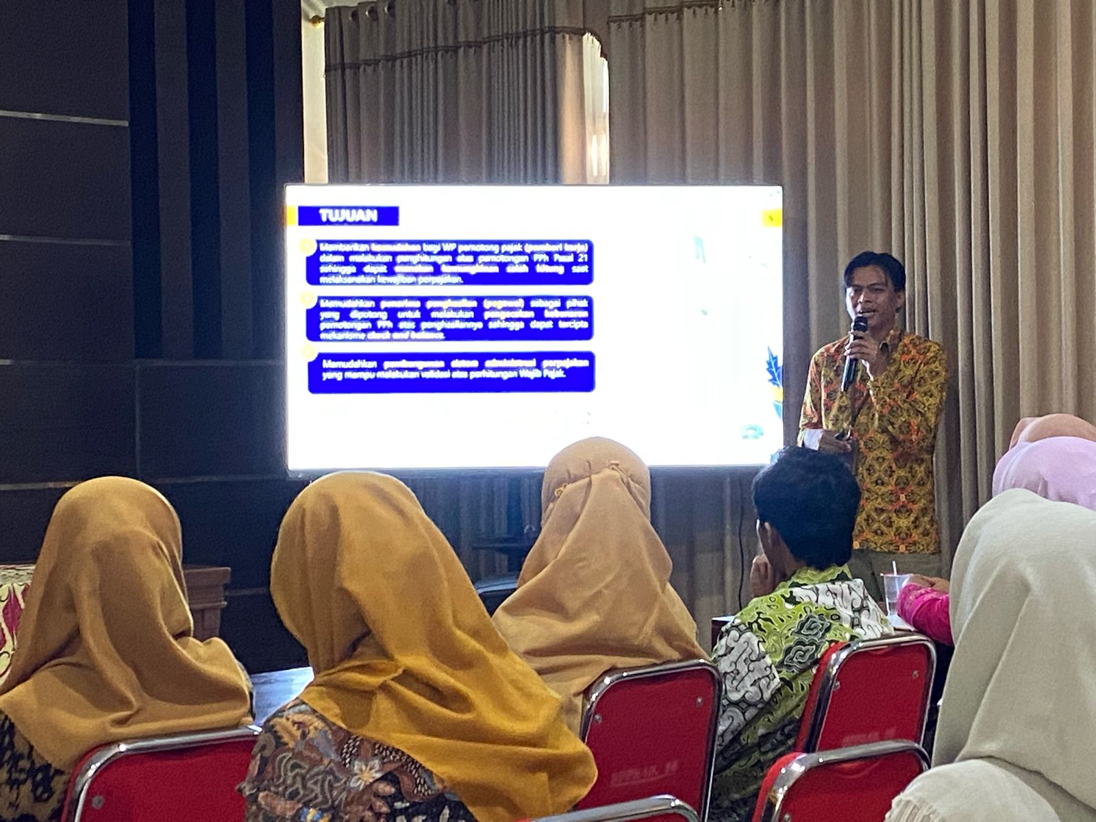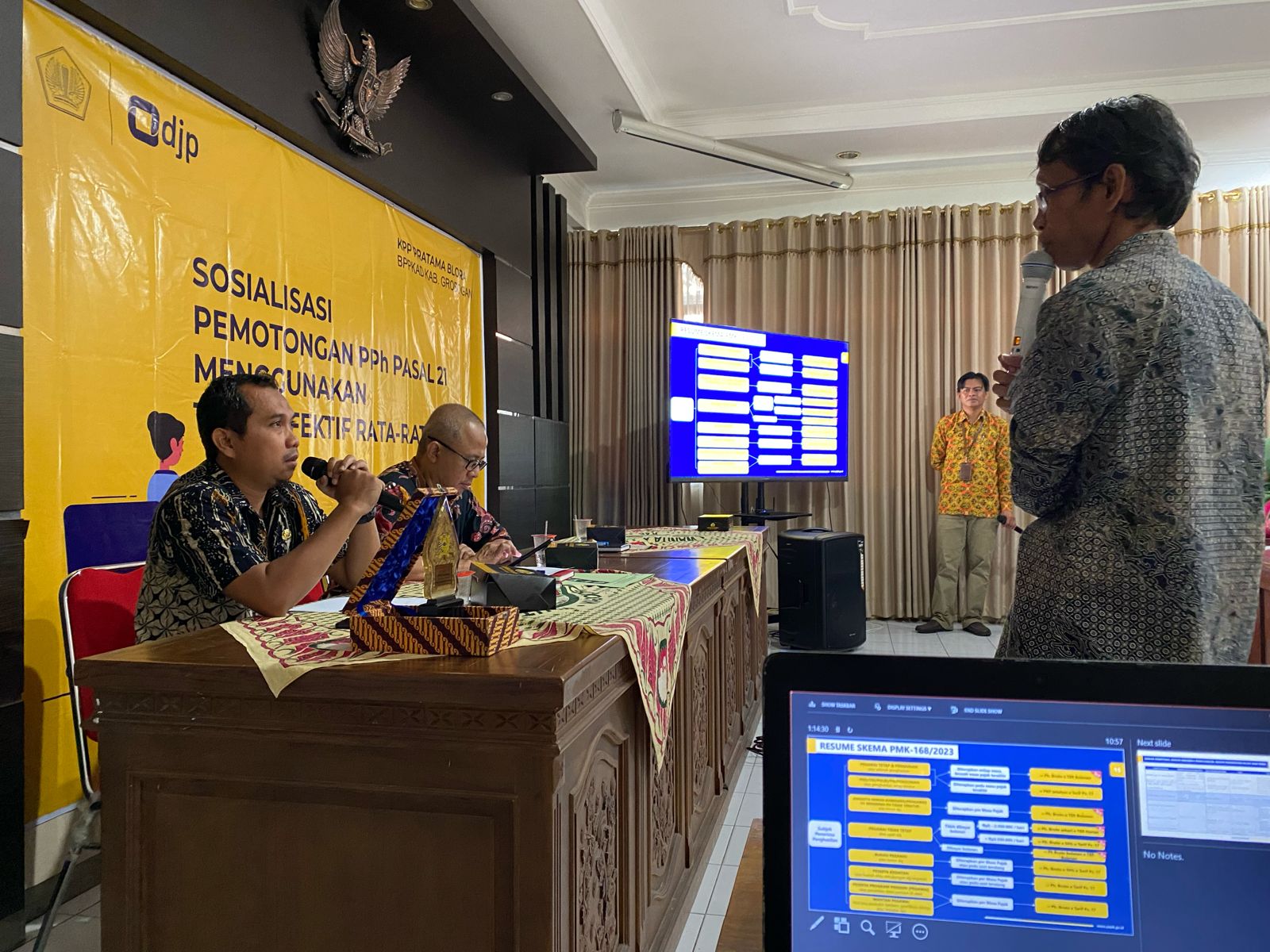Pada sesi materi, Tim Penyuluh dari KPP Pratama Blora, Ehud Rengkuh Riyanta dan Sugeng menyampaikan materi tentang pemotongan PPh Pasal 21 menggunakan TER yang mulai diberlakukan sejak 1 Januari 2024 sesuai Peraturan Pemerintah Nomor PP 58 Tahun 2023 dan Peraturan Menteri Keuangan Nomor PMK 168 Tahun 2023. Pemaparan materi berlangsung lancar, banyak peserta yang langsung mengangkat tangan untuk bertanya tanpa menunggu sesi diskusi, termasuk Kepala BPPKAD yang menanyakan tentang perlakuan pajak atas Tambahan Penghasilan Pegawai (TPP) yang diterima oleh PNS di wilayah Kabupaten Grobogan.