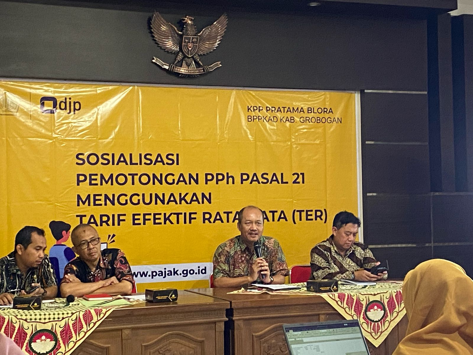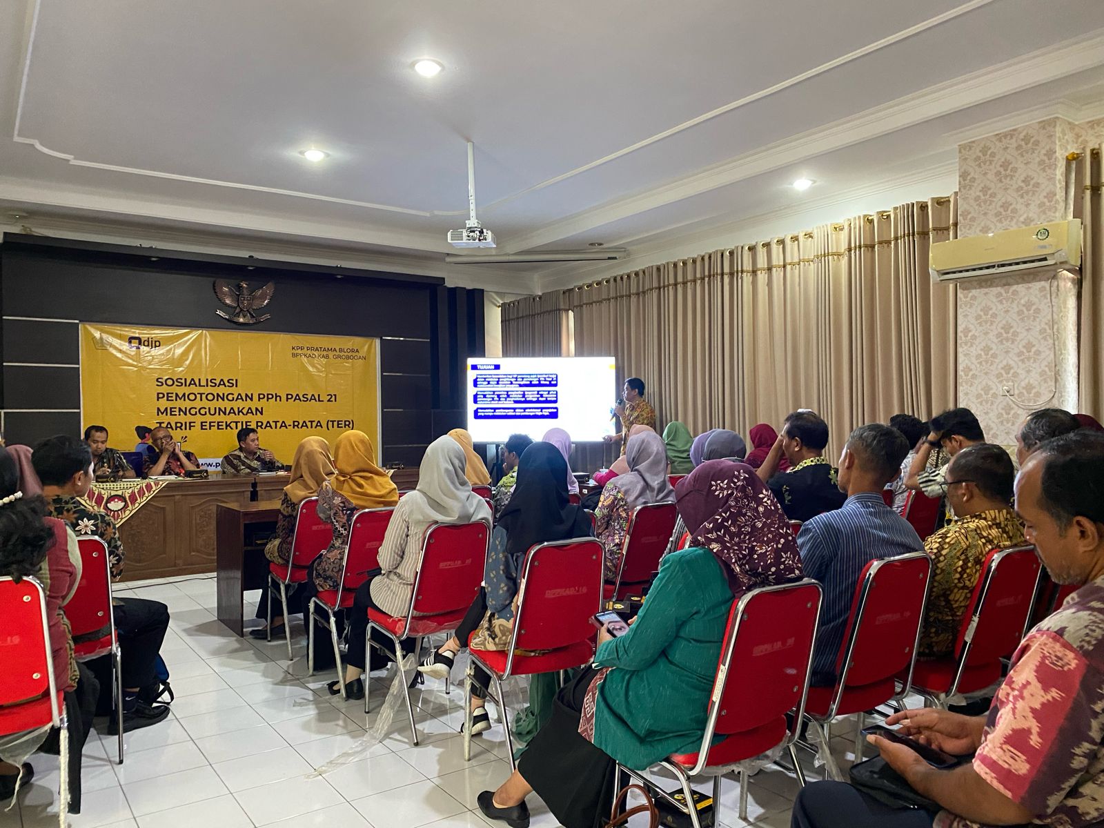 Kantor Pelayanan Pajak (KPP) Pratama Blora bersama Kantor Pelayanan Penyuluhan dan Konsultasi Perpajakan (KP2KP) Purwodadi bekerja sama dengan Badan Pendapatan, Pengelolaan Keuangan dan Aset Daerah (BPPKAD) menyelenggarakan sosialisasi perpajakan dengan tema Pemotongan PPh Pasal 21 Menggunakan Tarif Efektif Rata-Rata (TER) kepada seluruh Satuan Kerja Perangkat Daerah (SKPD) di wilayah Kabupaten Grobogan (Selasa, 20/2). Ada 51 SKPD yang diundang pada kegiatan sosialisasi ini. Masing-masing SKPD diwakili oleh satu orang Bendahara Gaji.