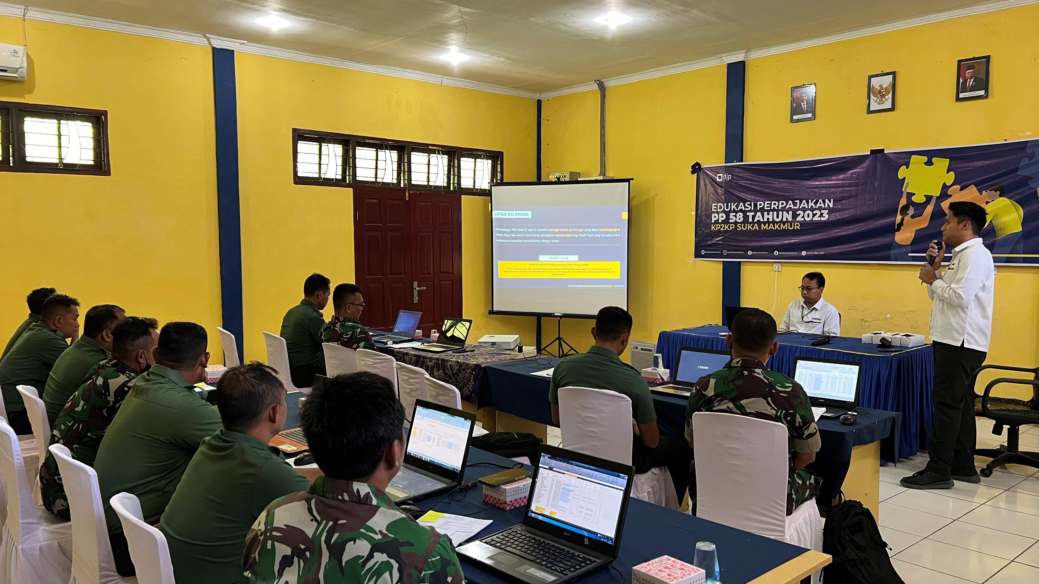 Kantor Pelayanan, Penyuluhan dan Konsultasi Perpajakan (KP2KP) Suka Makmur didatangi puluhan personil Tentara Nasional Indonesia (TNI) di wilayah Kabupaten Nagan Raya, Provinsi Aceh (Senin, 26/2). Puluhan personil TNI tersebut mendatangi KP2KP Suka Makmur untuk menghadiri Sosialisasi Peraturan Pemerintah (PP) 58 Tahun 2023 tentang Penghitungan Pajak Penghasilan (PPh) 21 Tarif Efektif Rata-rata (TER) dan Asistensi Pelaporan Surat Pemberitahuan (SPT) Tahunan Tahun Pajak 2023.