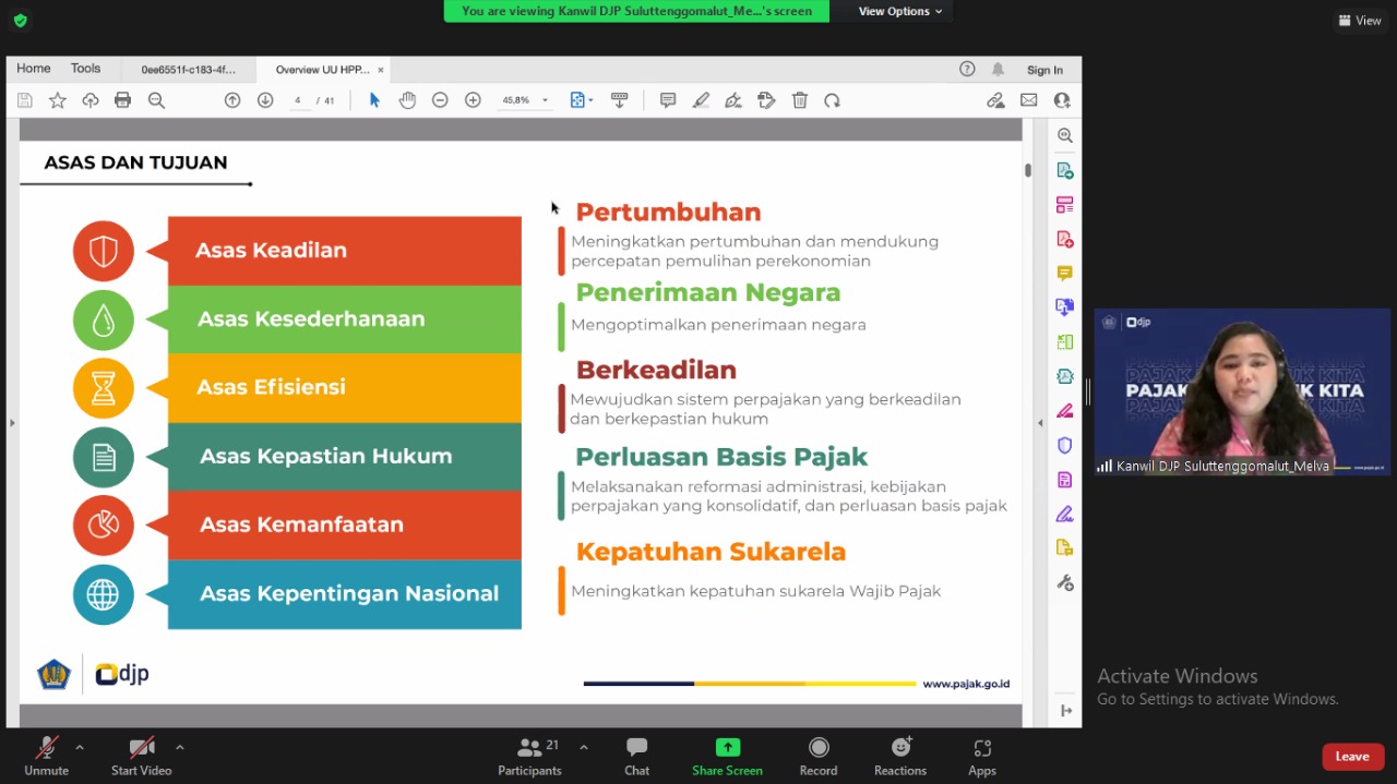 Dalam kegiatan ini, penyampaian materi dibagi menjadi dua sesi. Pada sesi pertama, Melva menyampaikan mengenai materi terkait Undang-Undang Nomor 7 Tahun 2021 tentang Harmonisasi Peraturan Perpajakan (UU HPP) beserta dengan perubahan-perubahan pada ketentuan perpajakan yang disebabkan terbitnya UU HPP tersebut. Pada sesi kedua, Dasa menyampaikan materi terkait Program Pengungkapan Sukarela (PPS) dan tidak lupa mengingatkan kepada para relawan pajak untuk menyebarluaskan informasi terkait PPS ini kepada masyarakat.