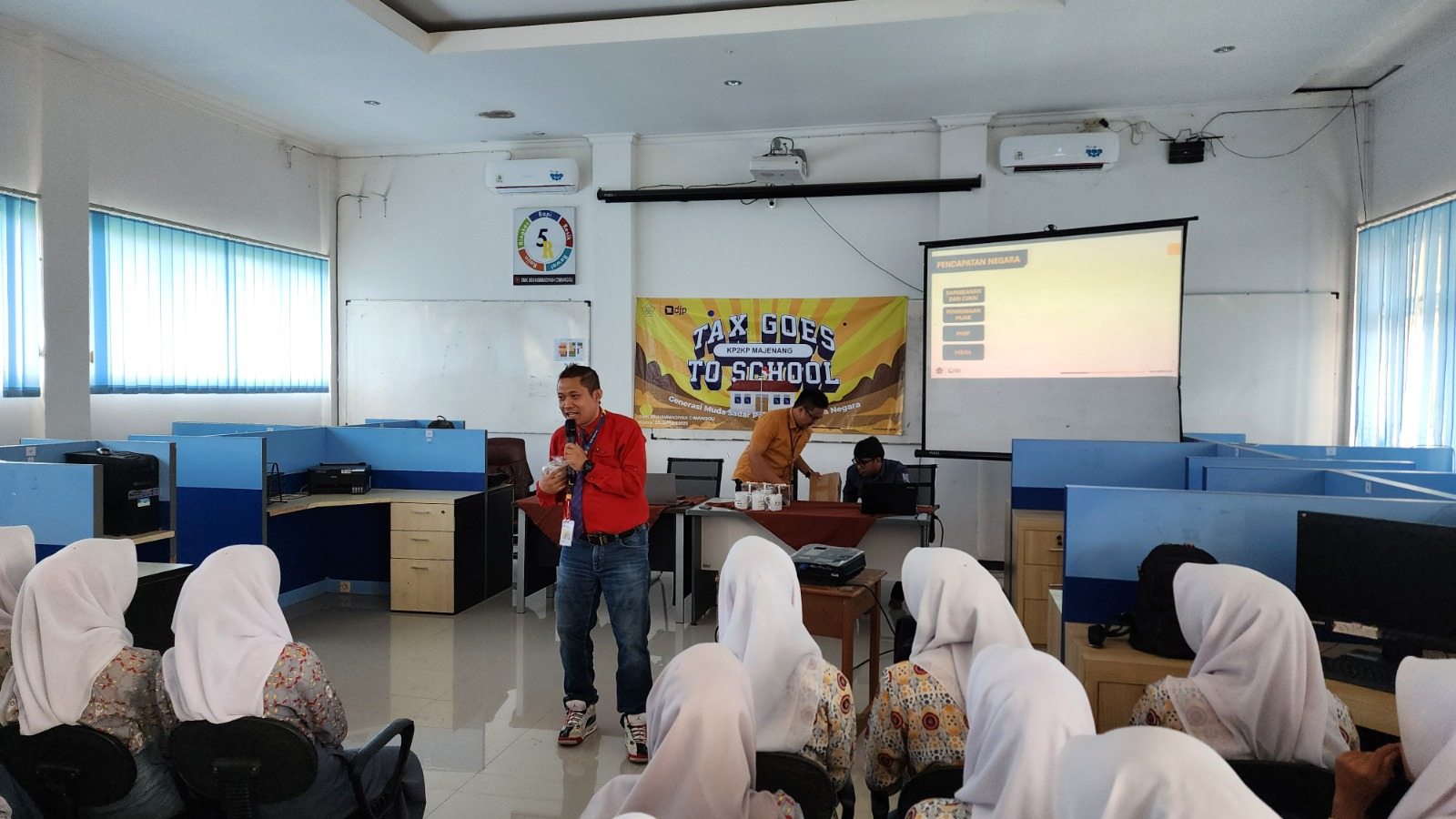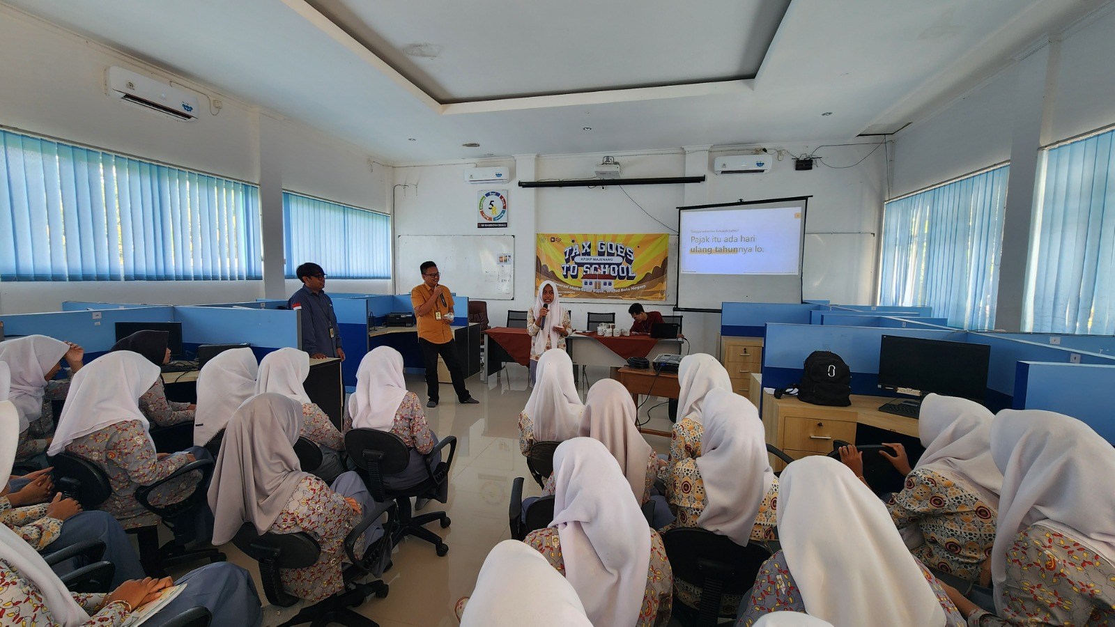 Puluhan siswa dari berbagai kelas di Sekolah Menengah Kejuruan (SMK) Muhammadiyah Cimanggu mengikuti kegiatan Tax Goes To School (TGTS) Tahun 2025 yang diselenggarakan oleh Kantor Pelayanan, Penyuluhan dan Konsultasi Perpajakan (KP2KP) Majenang, Kabupaten Cilacap (Kamis, 23/1). Kegiatan ini bertujuan untuk meningkatkan pemahaman siswa mengenai pentingnya pajak dalam pembangunan negara serta kewajiban membayar pajak sejak dini.