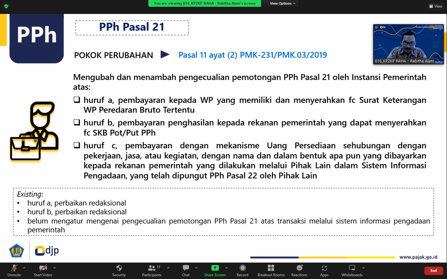 Kepala KP2KP Raha menyampaikan secara langsung materi Webinar Perpajakan Bendahara. Peserta memberikan sambutan yang sangat antusias. Kegiatan ini dihadiri sekitar dua puluh empat peserta webinar yang didominasi oleh bendahara instansi pemerintah dan mahasiswa. Antusiasme para peserta tergambar dengan jelas dari banyaknya pertanyaan yang diajukan pada sesi tanya jawab, baik melalui google form pada saat registrasi peserta maupun secara daring melalui Zoom Meeting dengan narasumber.