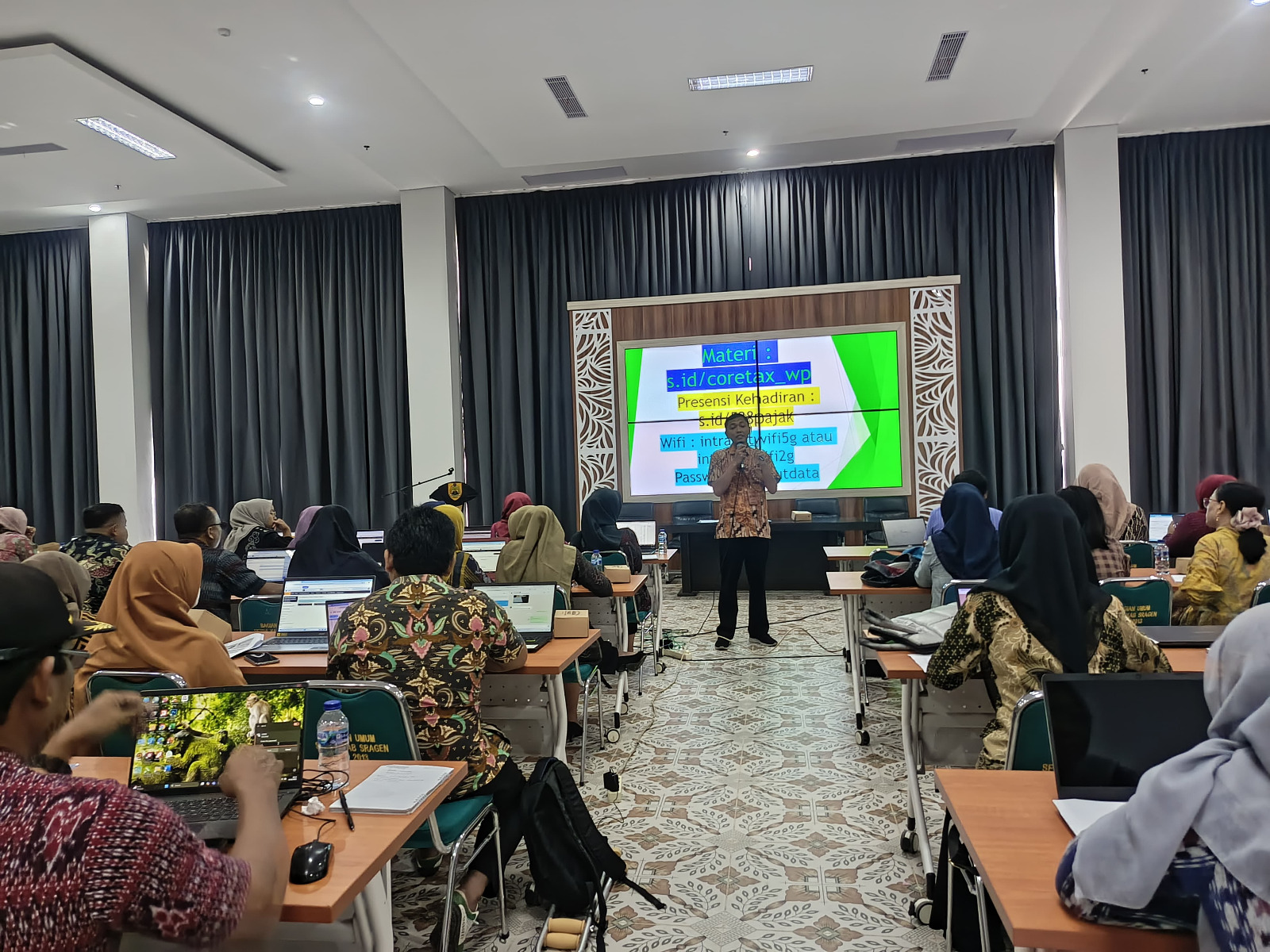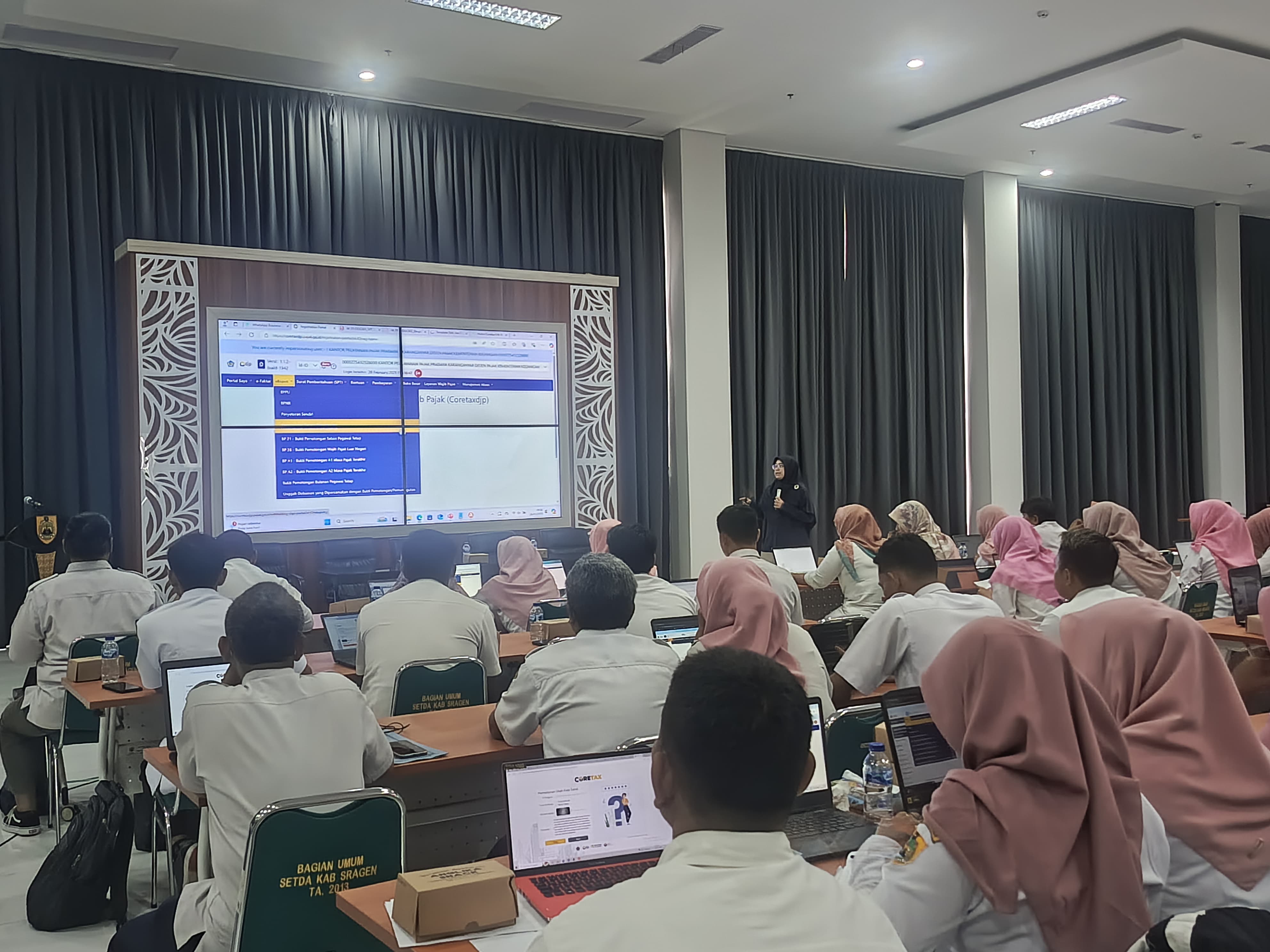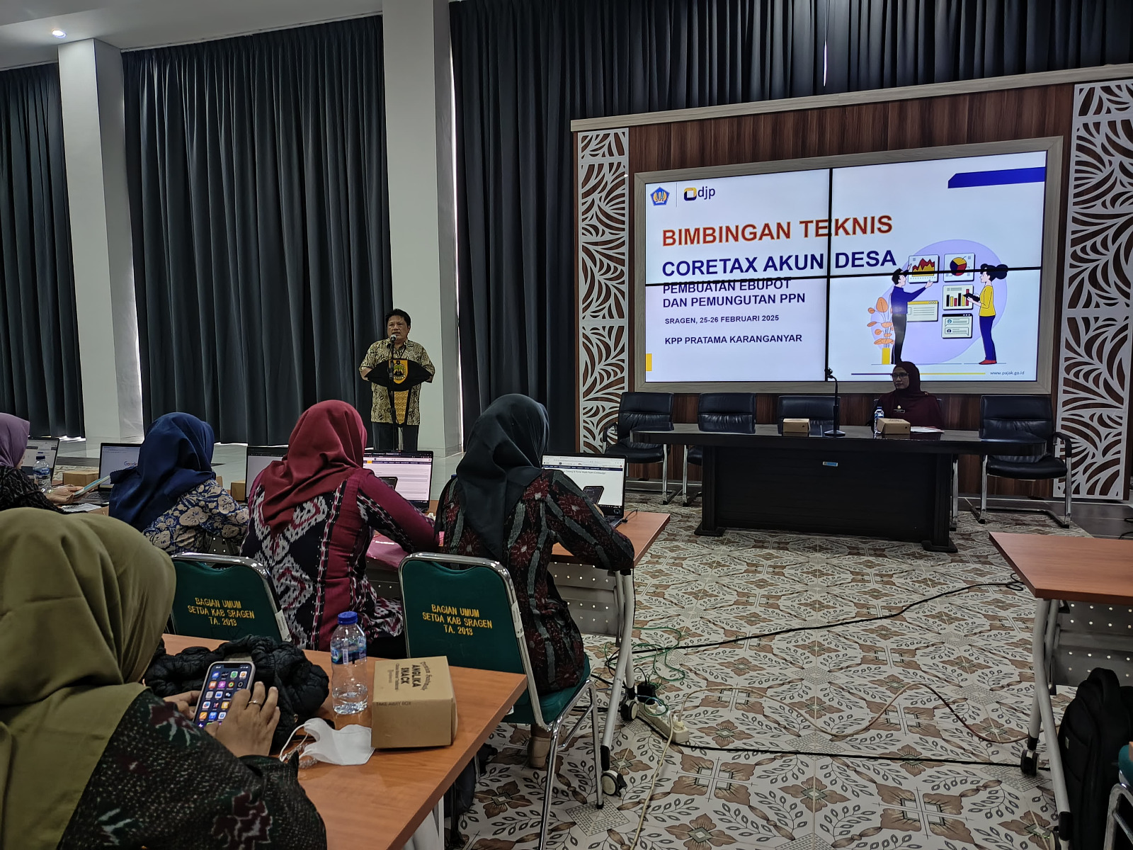 Kantor Pelayanan Pajak (KPP) Pratama Karanganyar mengumpulkan seluruh Bendahara Desa di Kabupaten Sragen untuk mengikuti Bimbingan Teknis (Bimtek) Coretax DJP, Kabupaten Karanganyar, Jawa Tengah (Rabu, 26/2). Kegiatan berlangsung selama dua hari, dari tanggal 25-26 Februari 2025 di Ruang Pertemuan Kantor Terpadu Pemerintah Daerah Kecamatan Sragen.