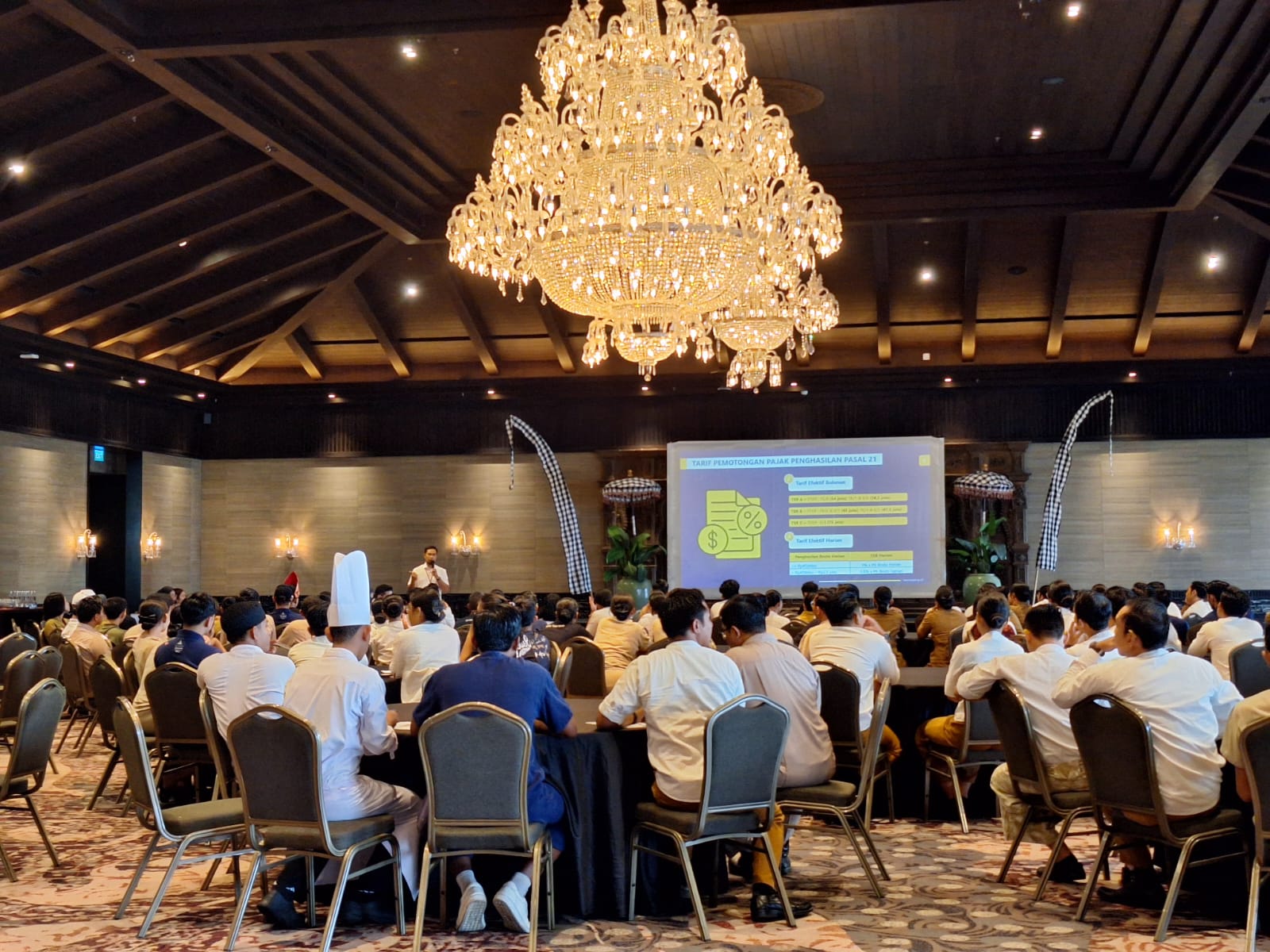 Kantor Pelayanan Pajak (KPP) Pratama Badung Selatan memberikan edukasi terkait Peraturan Pemotongan PPh Pasal 21 menggunakan Tarif Efektif Rata-rata (TER) serta tata cara pelaporan Surat Pemberitahuan (SPT) Tahunan di Hotel Apurva Kempinski Bali (Senin, 12/1).