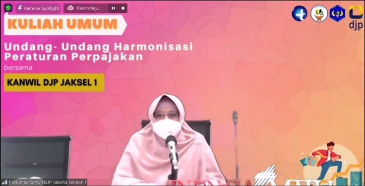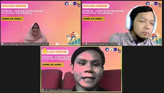 Fungsional Penyuluh Kantor Wilayah DJP Jakarta Selatan I menjadi narasumber pada Kuliah Umum Perpajakan yang dilaksanakan secara daring oleh Universitas MH. Thamrin di Jakarta (13/1). Kegiatan yang bertujuan untuk meningkatkan pengetahuan Mahasiswa Akuntansi Perpajakan serta meningkatkan kesadaran pajak bagi Mahasiswa Perguruan Tinggi ini diikuti oleh 231 mahasiswa dari universitas MH Thamrin dan terbuka untuk mahasiswa umum.