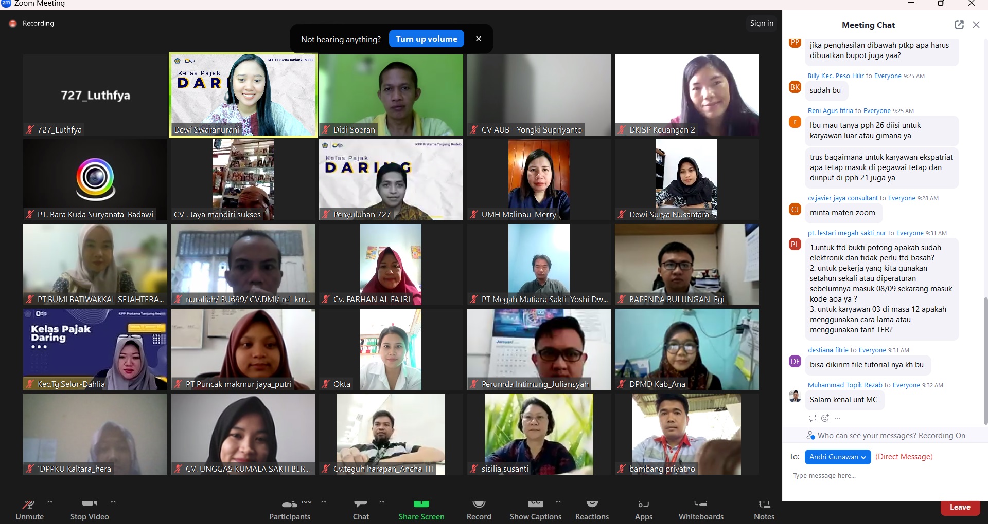 “Selamat pagi Bapak Ibu sekalian, di kelas pajak kali ini kita akan membahas Peraturan Direktur Jenderal Pajak Nomor PER-2/PJ/2024 tentang bentuk dan tata cara pembuatan bukti pemotongan Pajak Penghasilan (PPh) Pasal 21 dan PPh Pasal 26 serta bentuk, isi, tata cara pengisian, serta tata cara penyampaian Surat Pemberitahuan (SPT) Masa PPh 21/26 yang akan disampaikan oleh para Asisten Penyuluh Pajak Kantor Pelayanan Pajak (KPP) Pratama Tanjung Redeb,” jelas Dewi Setya Swaranurani selaku pegawai KPP Tanjung Redeb yang sedang bertugas sebagai pembawa acara kelas pajak daring melalui aplikasi Zoom Meeting ini. Kegiatan yang dilaksanakan selama dua jam ini berlokasi di KPP Pratama Tanjung Redeb, Jalan Jenderal Sudirman No 104, Pamusian, Tarakan Tengah, Kota Tarakan, Kalimantan Utara (Jumat, 16/2).