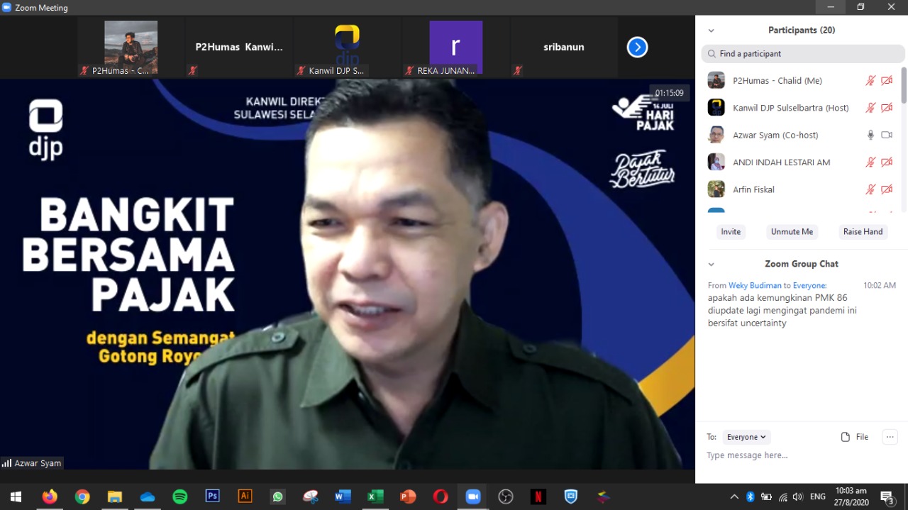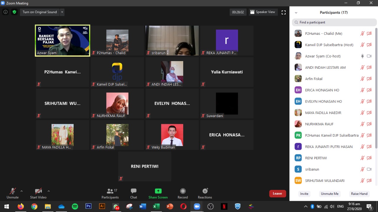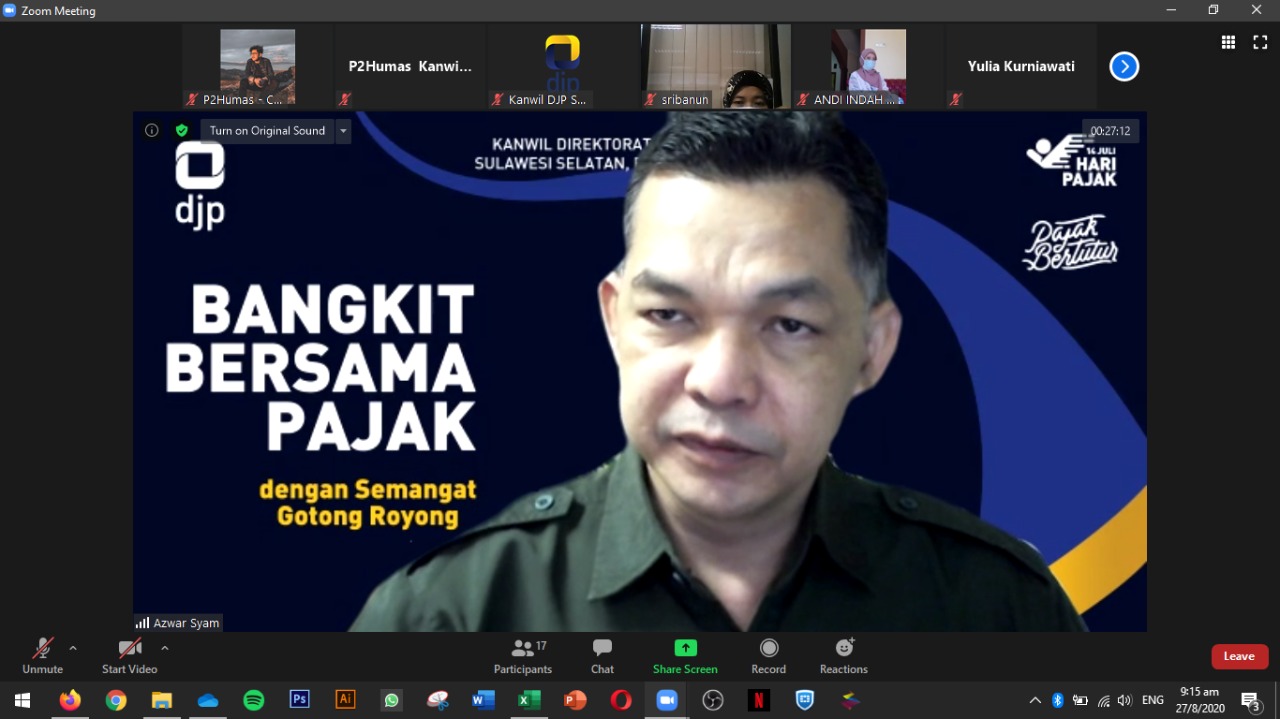 Kanwil DJP Sulawesi Selatan, Barat, dan Tenggara (Sulselbartra) melaksanakan kegiatan sosialisasi perpajakan secara daring yang dikemas dalam acara Kelas Pajak Online (Kamis, 27/8). Kegiatan yang diadakan melalui aplikasi webinar zoom meeting ini dilangsungkan di Kota Makassar dan lokasi tempat kedudukan masing-masing peserta acara.