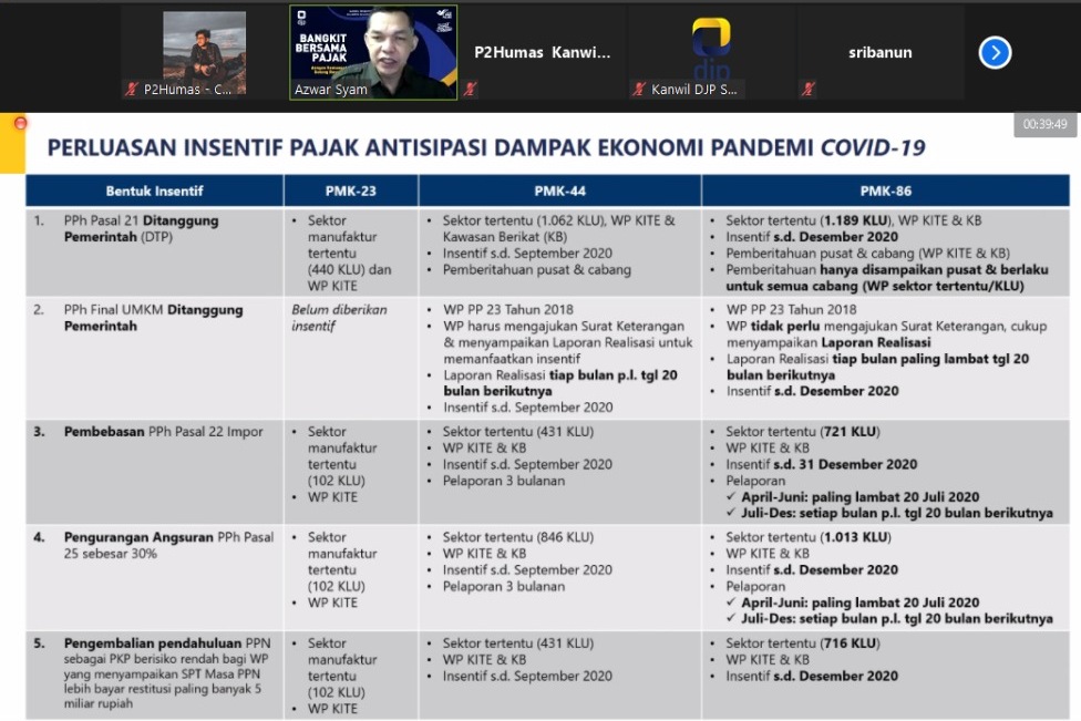 Pada Kelas Pajak Online kali ini, tim penyuluh perpajakan Kanwil DJP Sulselbartra menyampaikan materi mengenai insentif pajak untuk wajib pajak terdampak pandemi Covid-19. Para peserta mengikuti jalannya acara dengan cukup antusias, sesi diskusi dan tanya jawab yang dilangsungkan seusai penyampaian materi pun diisi dengan beragam pertanyaan maupun pernyataan dari peserta acara yang cukup aktif dan komunikatif. Di penghujung acara, para peserta Kelas Pajak Online mendapatkan fasilitas berupa sertifikat elektronik dari penyelenggara kegiatan.