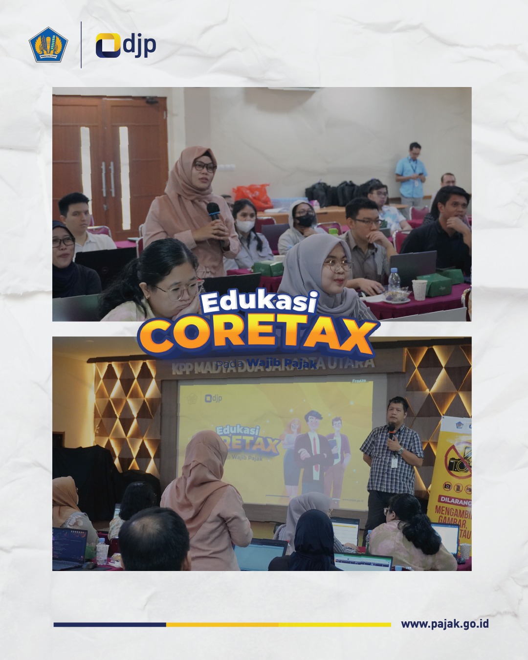 Kantor Pelayanan Pajak (KPP) Madya Dua Jakarta Utara menyelenggarakan kegiatan Edukasi Aplikasi Coretax Tahap I selama bulan Agustus 2024 sampai dengan bulan September 2024. Dimulai sejak 27 Agustus 2024 hingga 26 September 2024 pelatihan Edukasi Aplikasi Coretax Tahap I terbagi dalam 10 batch pelatihan. Dengan mengundang sebanyak 250 wajib pajak terpilih yang memenuhi kriteri yang telah ditetapkan Kantor Pusat Direktorat Jenderal Pajak (DJP) yang salah satu kriterianya adalah wajib pajak PKP. Pemilihan kriteria tersebut didasarkan pada pertimbangan bahwa wajib pajak PKP adalah wajib pajak yang secara aktif menggunakan layanan digital DJP meliputi e-faktur, e-bupot, e-billing dan sebagainya.
