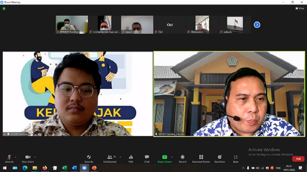 Kantor Pelayanan, Penyuluhan dan Konsultasi Perpajakan (KP2KP) Sambas menyelenggarakan Kelas Pajak Online Program Pengungkapan Sukarela (PPS) melalui aplikasi Zoom Meeting di Kabupaten Sambas (Jumat, 14/1). Para Peserta yang mengikuti Kelas Pajak berjumlah 11 orang.