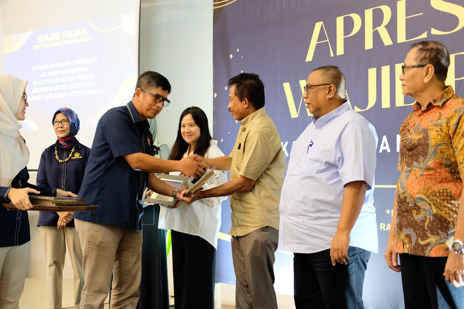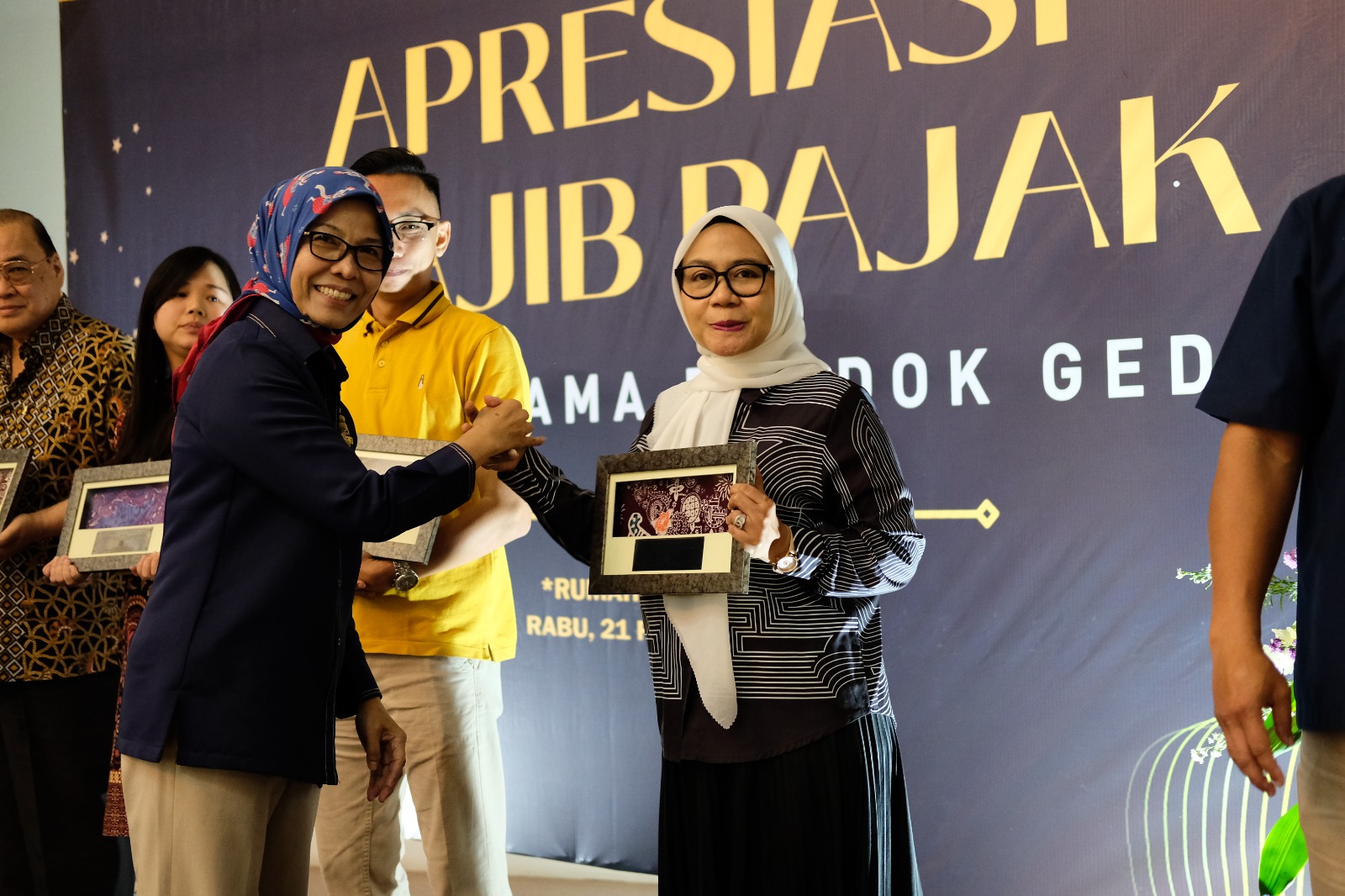 Kepala Kantor Wilayah Direktorat Jenderal Pajak (Kanwil DJP) Jawa Barat III Romadhaniah dan Kepala Kantor Pelayanan Pajak (KPP) Pratama Pondok Gede Faisal Fatahillah berikan penghargaan kepada 100 wajib pajak dengan kontribusi terbesar terhadap penerimaan pajak tahun 2023, di Rumah Perubahan, Kota Bekasi (Rabu, 21/2).