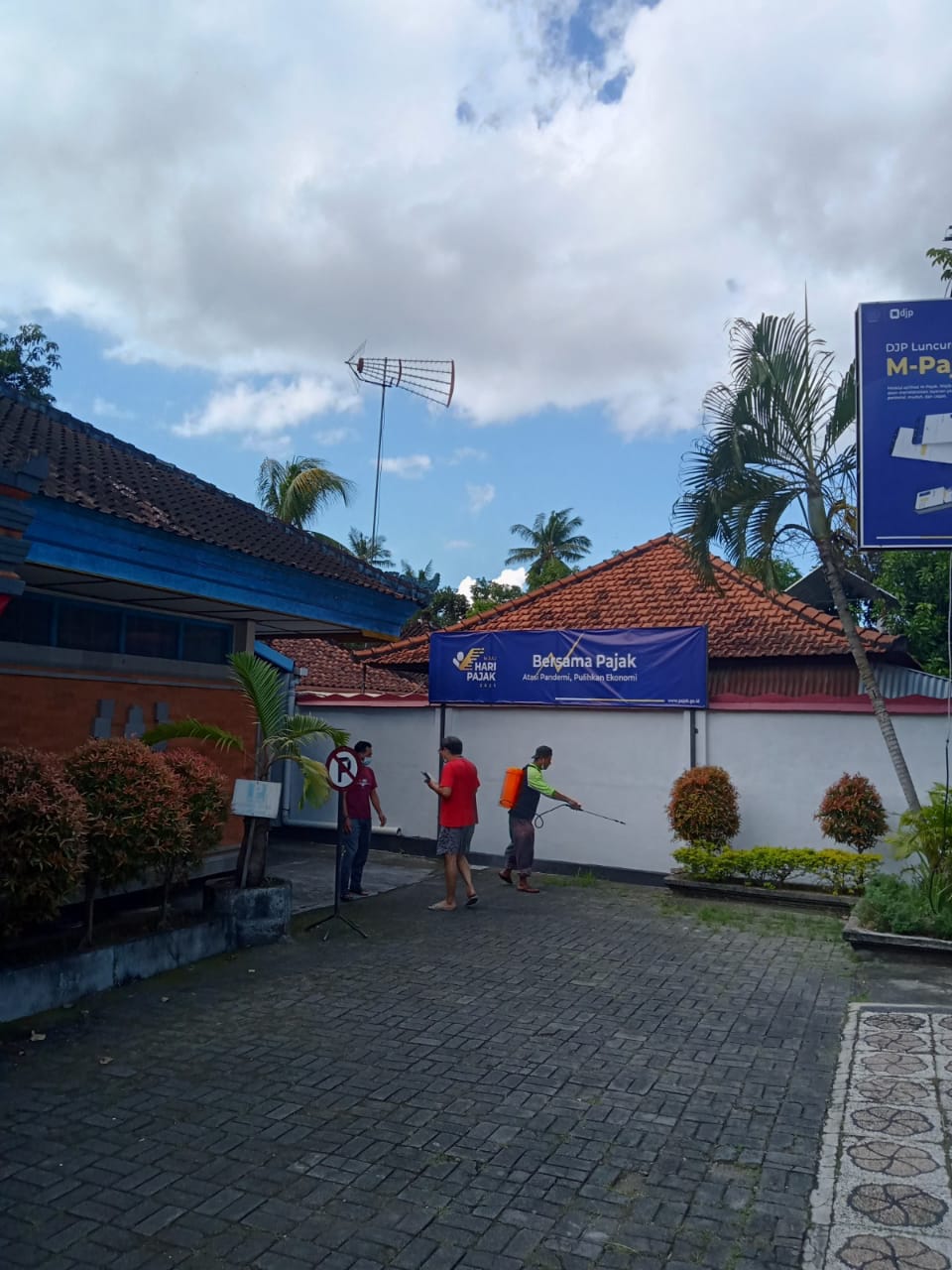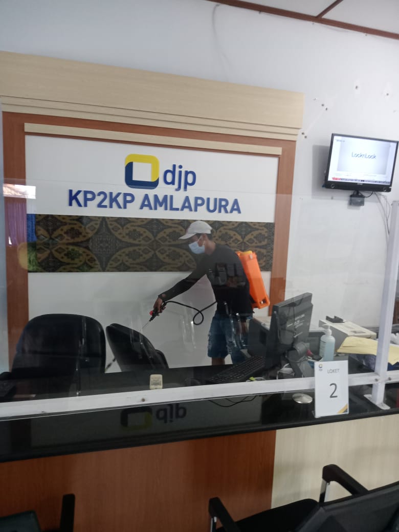Kantor Pelayanan, Penyuluhan, dan Konsultasi Perpajakan (KP2KP) Amlapura bersinergi dengan Dinas Kesehatan Kabupaten Karangasem melakukan penyemprotan disinfektan untuk mencegah Corona Virus Disease 2019 (Covid-19) di lingkungan KP2KP Amlapura, Kabupaten Karangasem (Sabtu, 10/7).