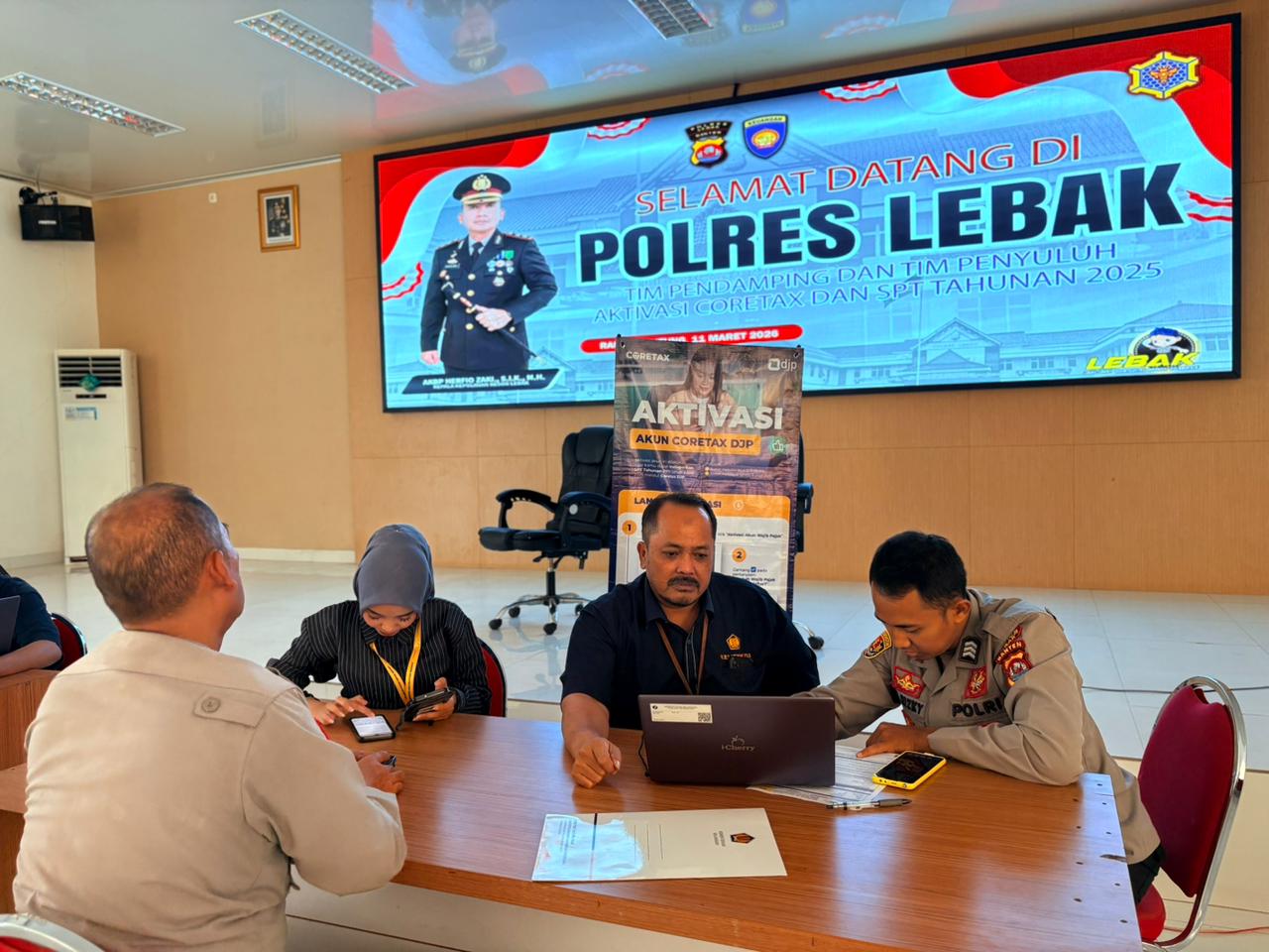 Kantor Pelayanan Pajak (KPP) Pratama Pandeglang menggelar layanan Pojok Pajak di Kepolisian Resor (Polres) Lebak (Rabu, 11/03). Kegiatan ini berlangsung dari pukul 09.00 hingga 14.00 WIB sebagai bagian dari upaya mendukung kelancaran pelaporan surat pemberitahuan (SPT) tahunan untuk tahun pajak 2025 melalui sistem Coretax DJP.