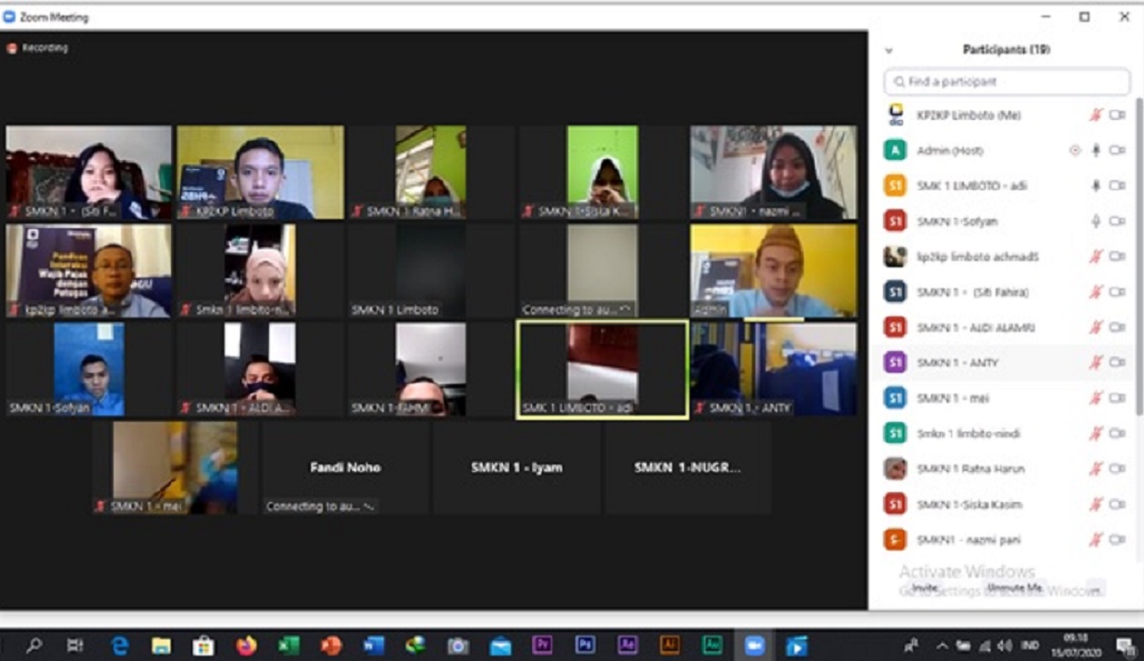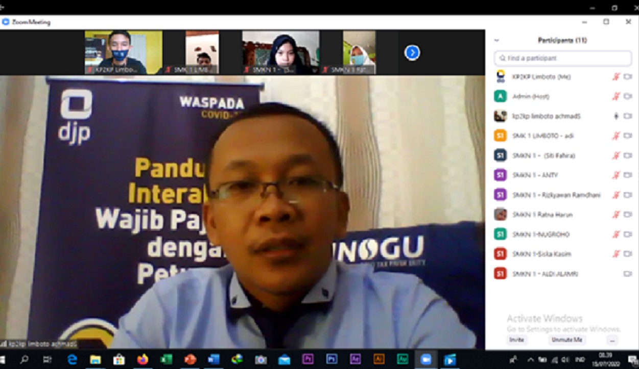 Kantor Pelayanan Penyuluhan dan Konsultasi Perpajakan (KP2KP) Limboto mengadakan kegiatan Tax Goes To School (TGTS) dalam rangka pengenalan perpajakan melalui aplikasi Zoom Meeting (Rabu, 19/8). Peserta TGTS adalah SMK Negeri 1 Limboto.