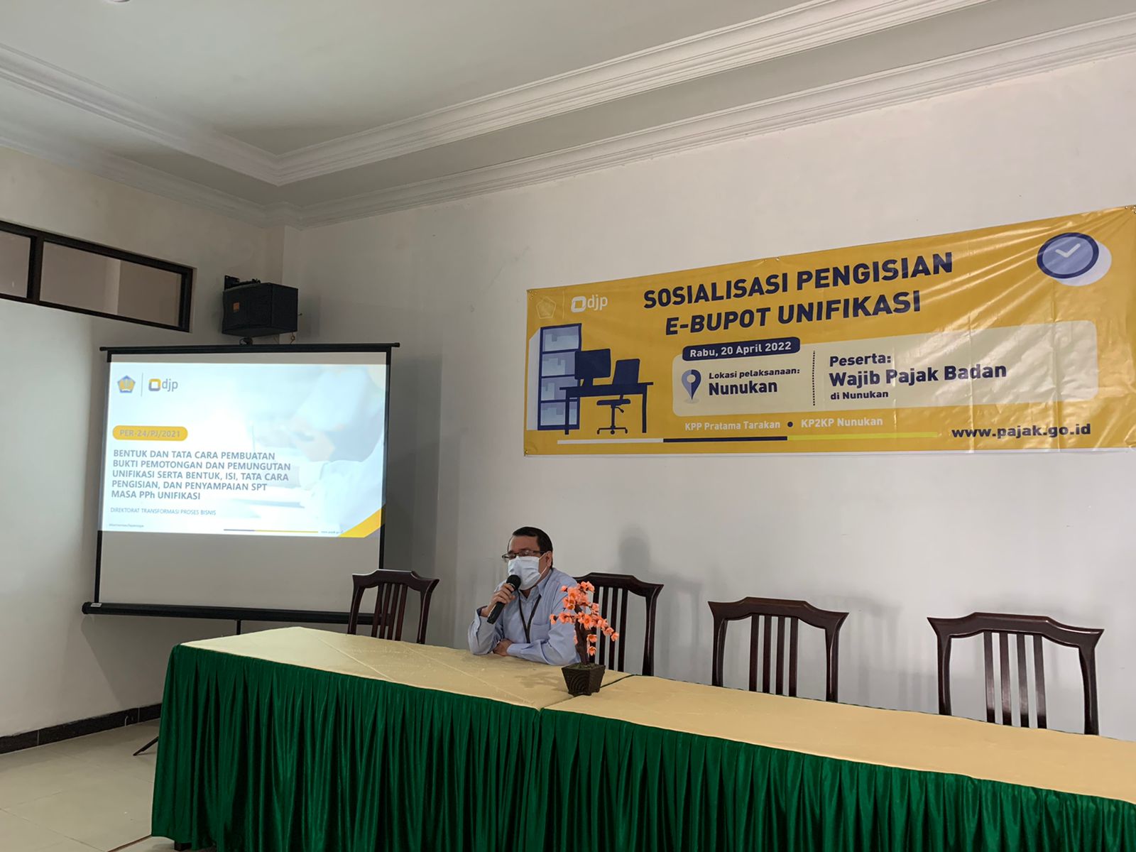 Kantor Pelayanan Pajak (KPP) Pratama Tarakan bersama Kantor Pelayanan, Penyuluhan, dan Konsultasi Perpajakan (KP2KP) Nunukan mengundang bendahara perusahaan di Kabupaten Nunukan dalam Sosialisasi e-Bupot Unifikasi di Hotel Lenfin, Kab. Nunukan (Rabu, 10/04).