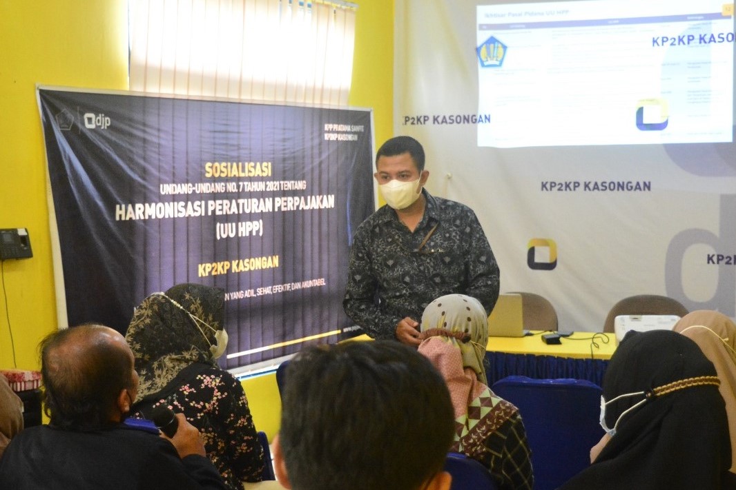 Kantor Pelayanan, Penyuluhan, dan Konsultasi Perpajakan (KP2KP) Kasongan menggelar Sosialisasi Undang-Undang Harmonisasi Peraturan Perpajakan dengan mengundang para pegiat UMKM di Wilayah Kabupaten Katingan secara tatap muka dengan protokol kesehatan bertempat back office KP2KP Kasongan (Selasa, 16/11).