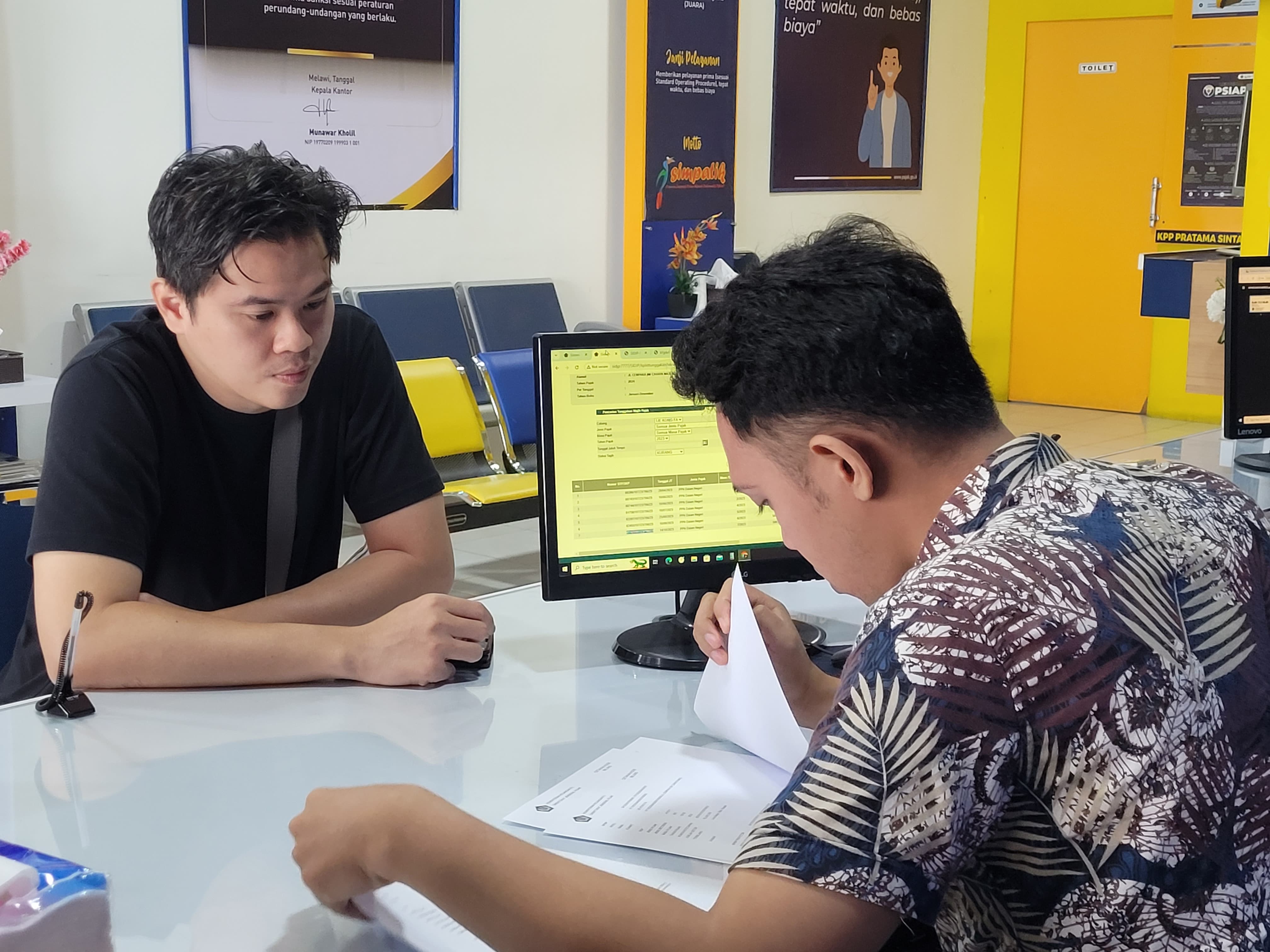 Salah seorang wajib pajak melakukan konsultasi mengenai tunggakan pajak berkenaan dengan surat pemberitahuan (SPT) masa pajak pertambahan nilai (PPN) bersama dengan Iqbal Pasuja, Petugas Pelayanan Kantor Pelayanan, Penyuluhan, dan Konsultasi Perpajakan (KP2KP) Nanga Pinoh di ruang tempat pelayanan terpadu KP2KP Nanga Pinoh, Kabupaten Melawi (Selasa, 27/8). Wajib pajak tersebut merupakan wajib pajak yang telah dikukuhkan sebagai pengusaha kena pajak (PKP).